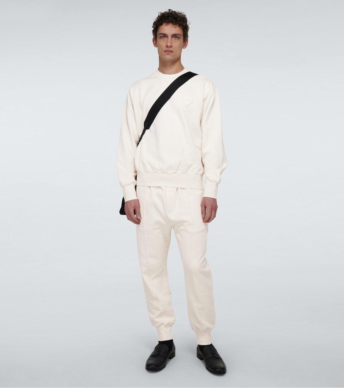 DotĂ© d’une coupe droite, ce pantalon de survĂȘtement blanc cassĂ© de Prada possĂšde un cordon de serrage Ă  la taille, des plis frontaux ainsi qu’un logo triangle emblĂ©matique Ă  l’arriĂšre.