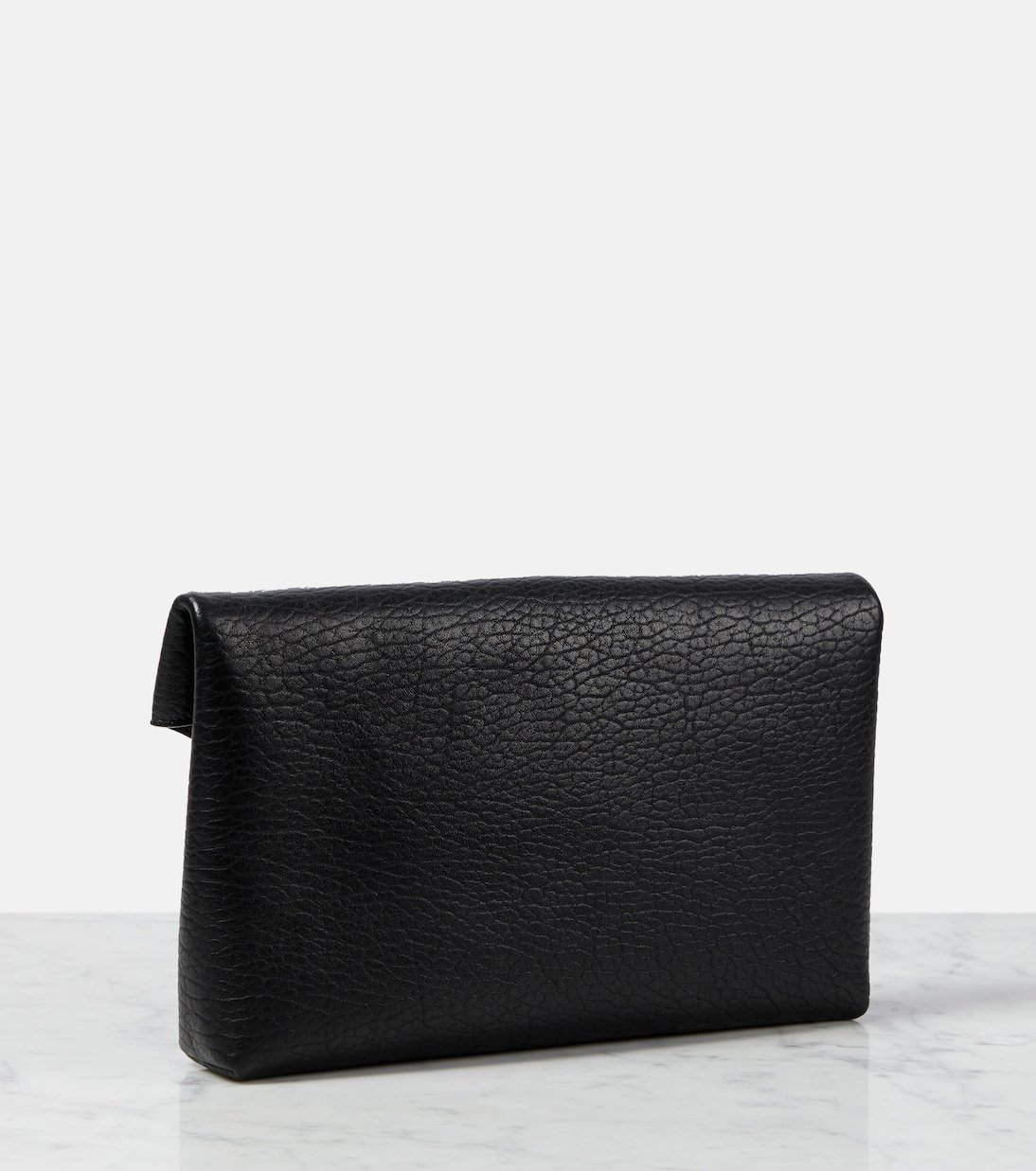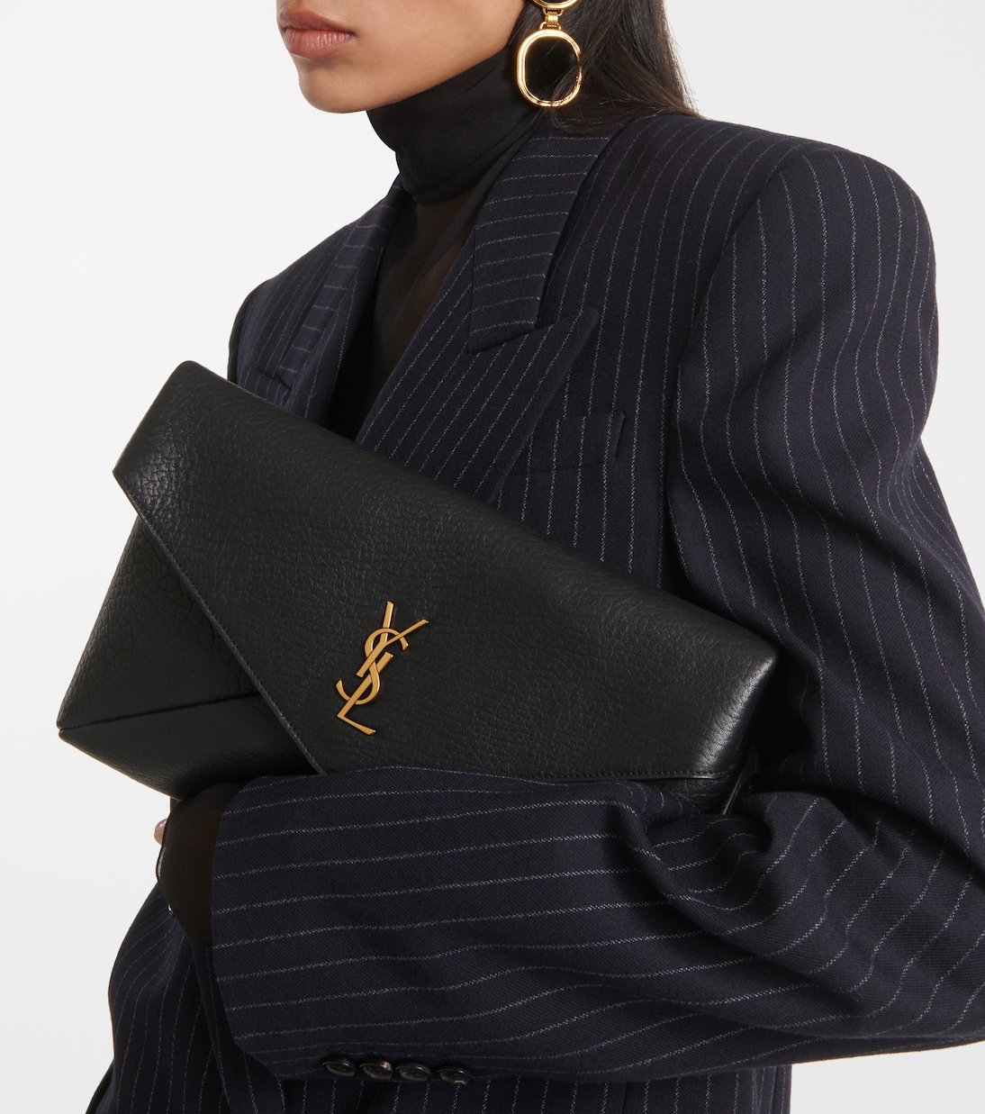L’un des symboles les plus célèbres de la mode, le monogramme YSL, se compose des initiales entremêlées du fondateur de Saint Laurent. Il apparaît sur cette pochette enveloppe Large réalisée en cuir grainé noir.