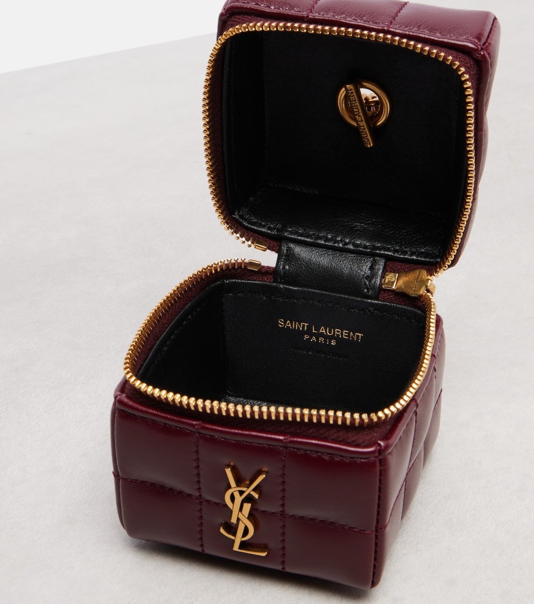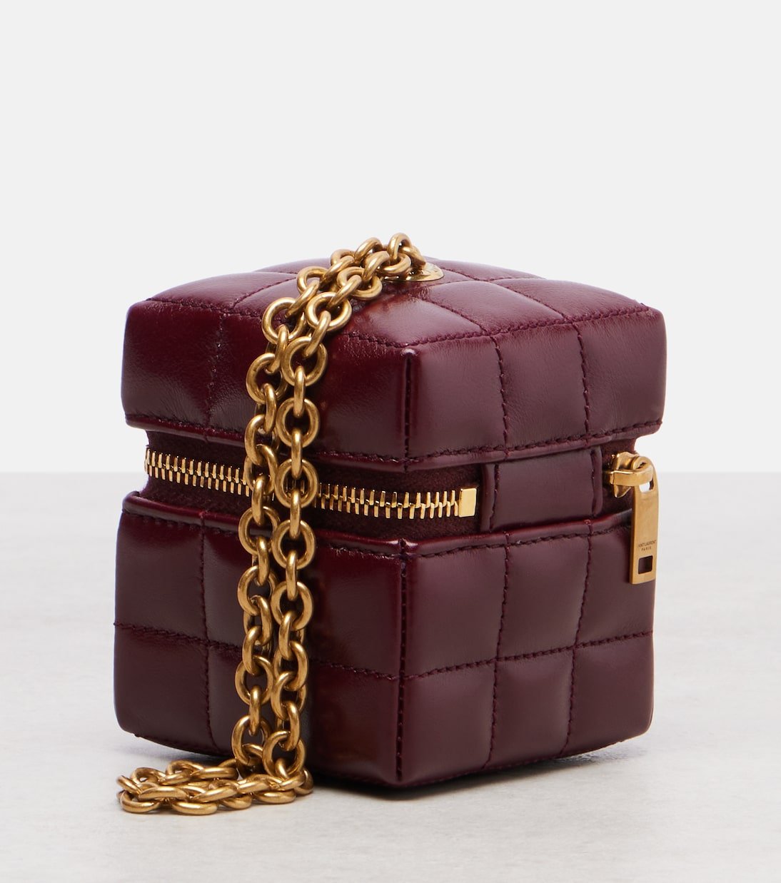 Depuis sa création en 1961, Saint Laurent est plébiscité pour son esthétique parisienne élégante. Réalisée en cuir bordeaux dans une forme cubique, la pochette Cassandre Mini arbore la signature emblématique du label, des finitions métalliques dorées et est suspendue à une bandoulière chaîne.