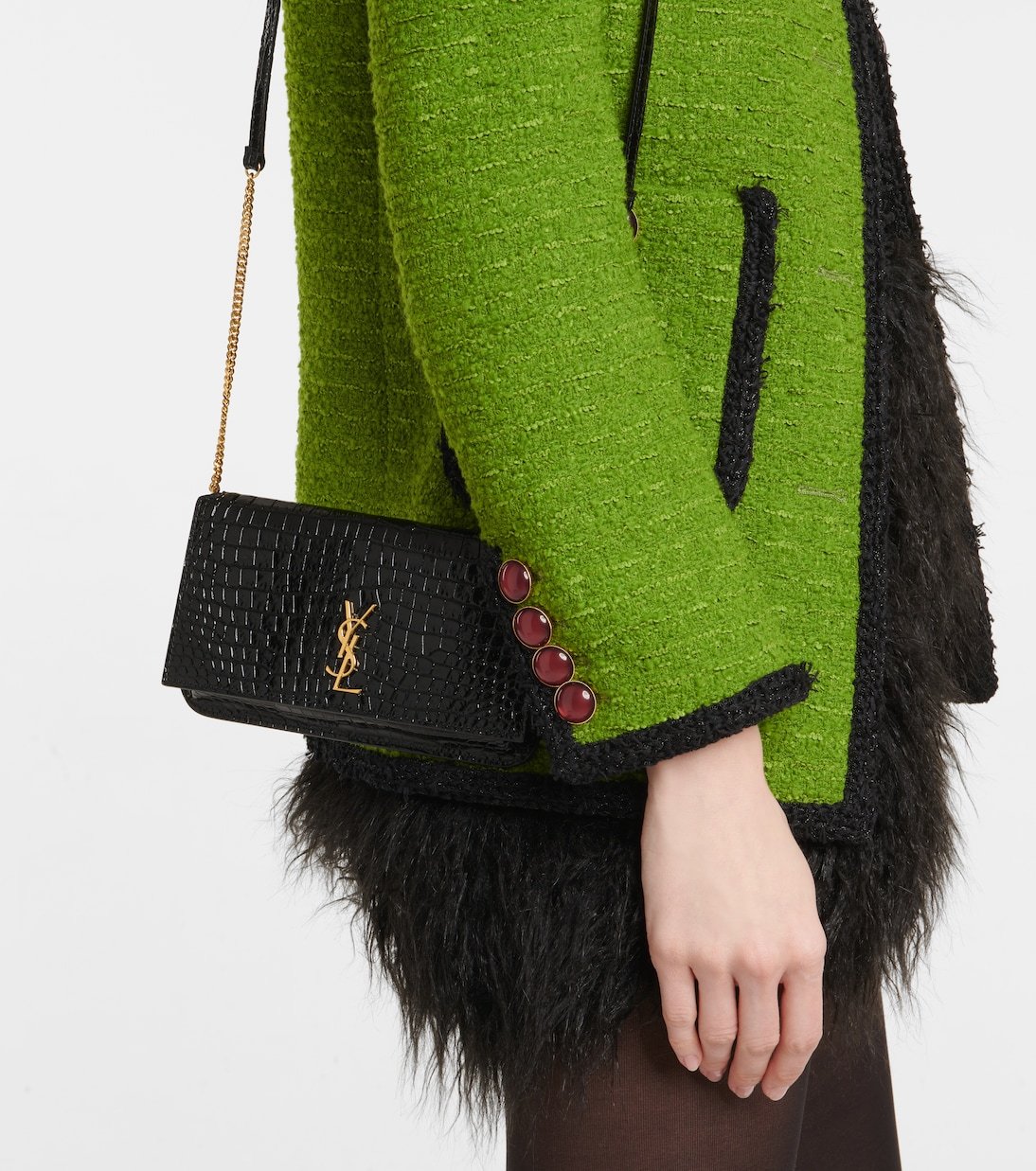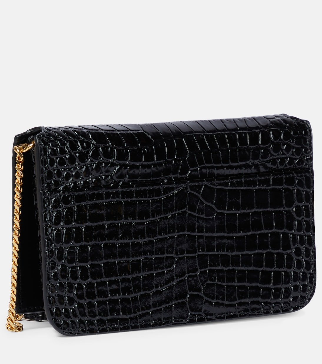 La célèbre collection d’accessoires de Saint Laurent accueille cette pochette pour téléphone à bandoulière chaîne amovible. Conçu en cuir embossé façon croco brillant, elle est ornée du monogramme Cassandre doré.