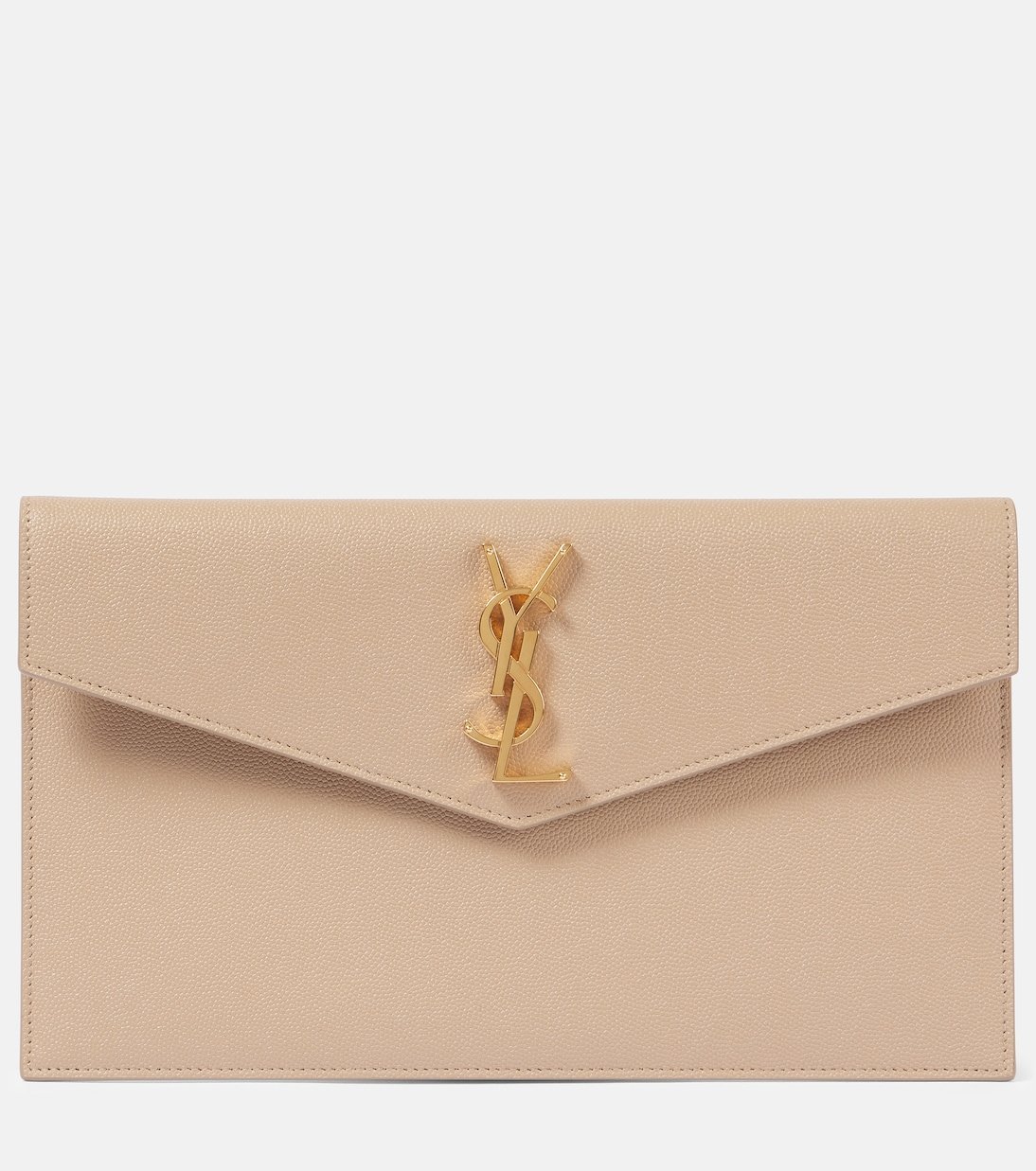 Luxueuse avec son cuir lisse beige, la pochette Uptown de la maison Saint Laurent doit son allure résolument chic à sa plaque en métal doré dont les initiales « YSL » signent un grand nom de la mode française. Épurée et intemporelle avec sa silhouette enveloppe, elle vous accompagnera de jour comme de nuit.