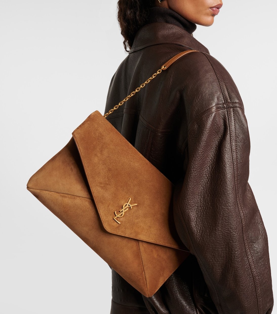 Le monogramme YSL, l’un des symboles les plus célèbres de la mode, se compose des initiales entremêlées du fondateur de Saint Laurent. Rehaussé de détails emblématiques, le sac Cassandre est confectionné avec savoir-faire en daim et dispose d’une fermeture à rabat.