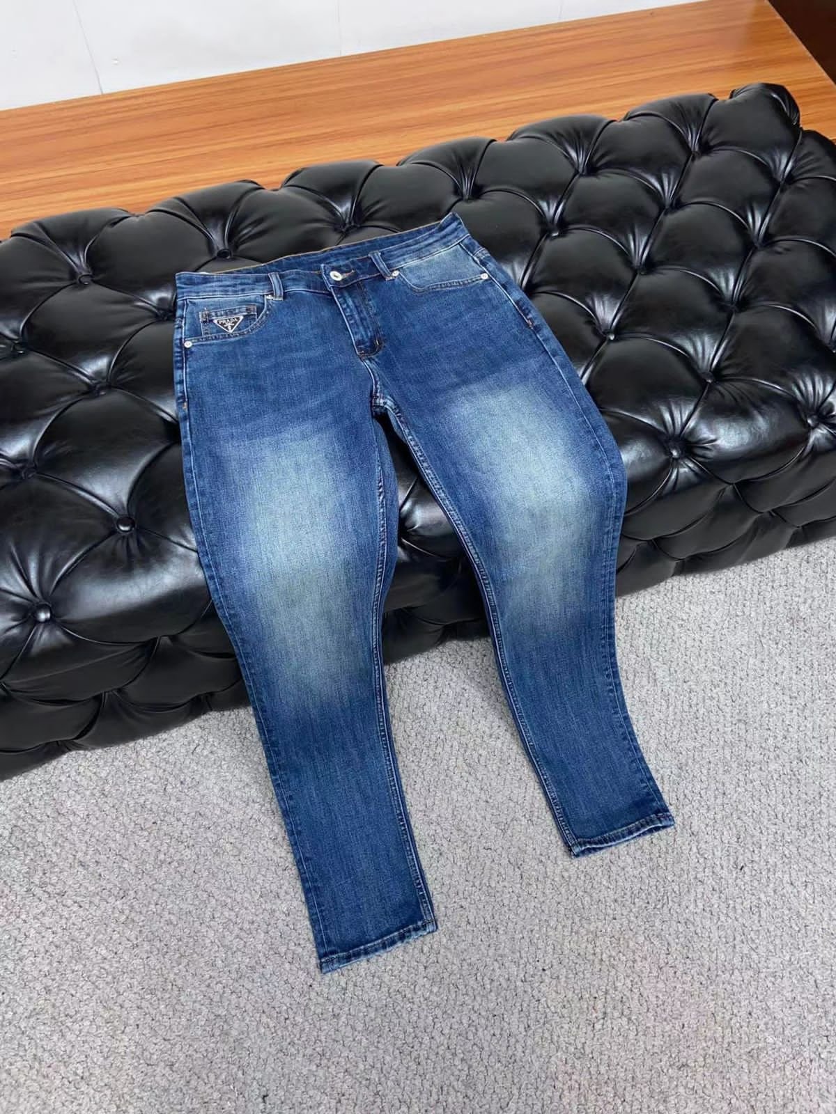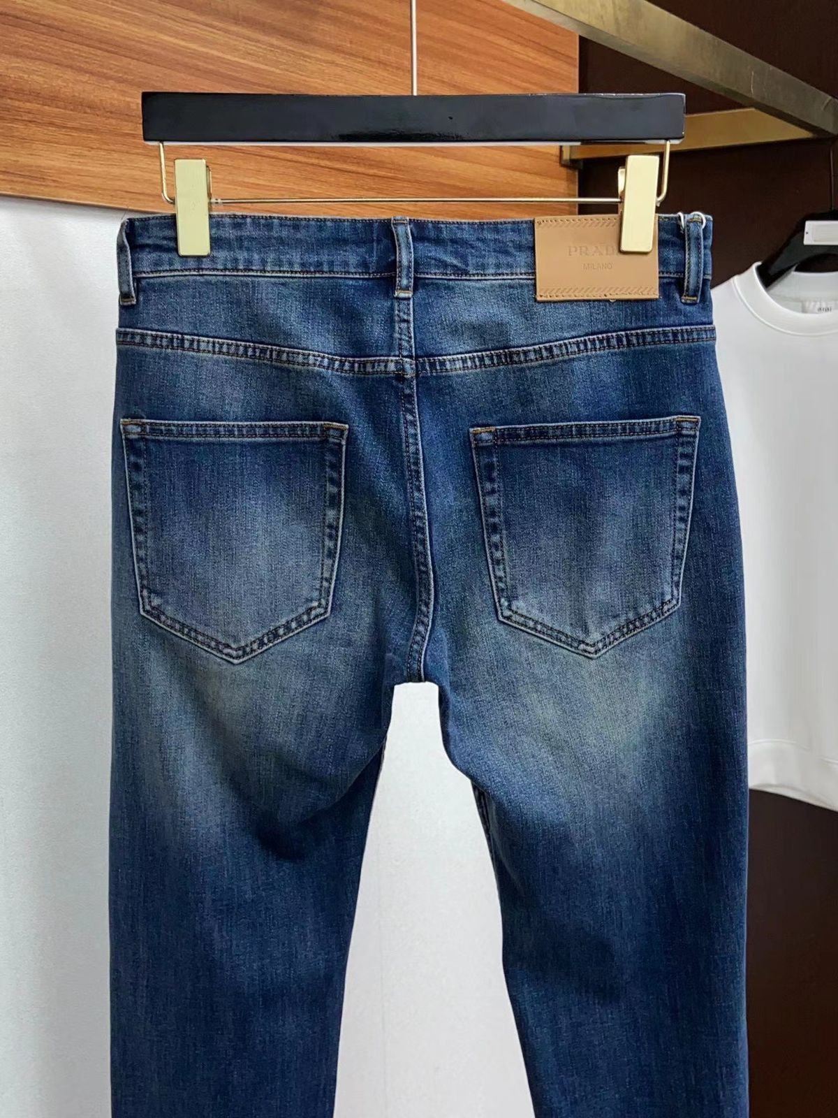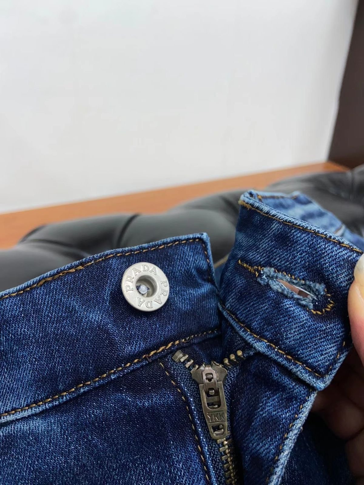 PRADA || Pantalon en denim bleu délavé micro-élastique P Family Pra Triangle, denim décontracté de créateur