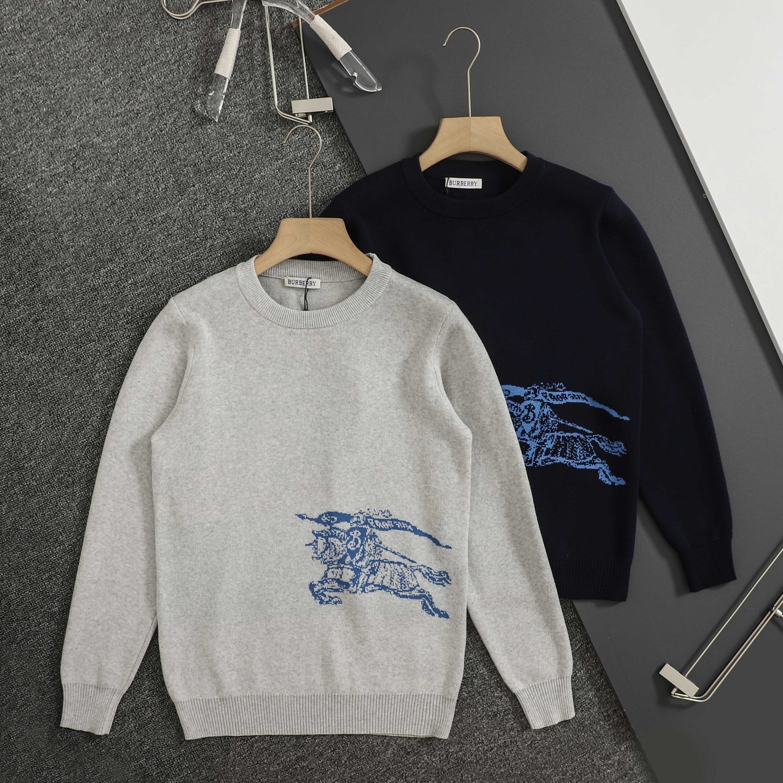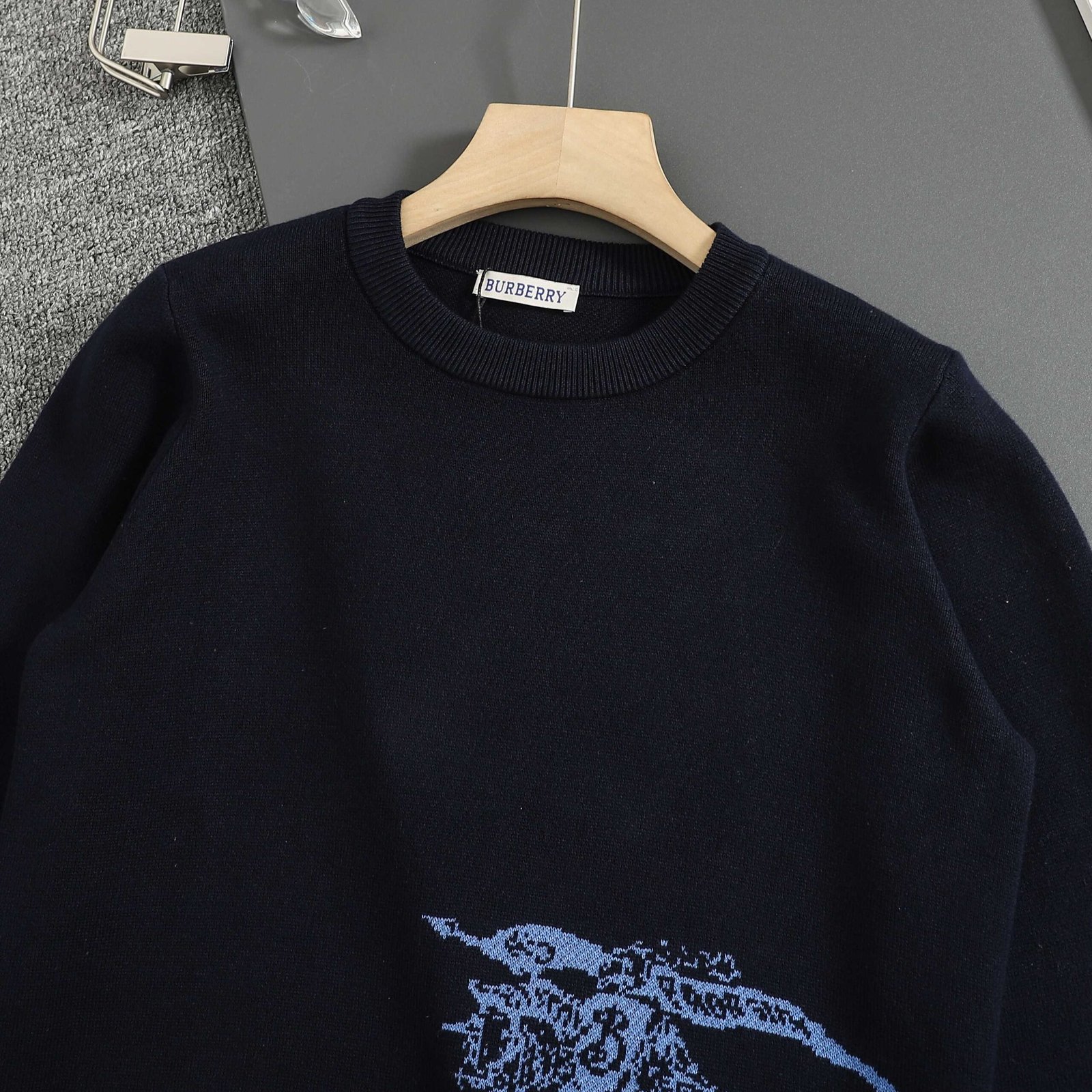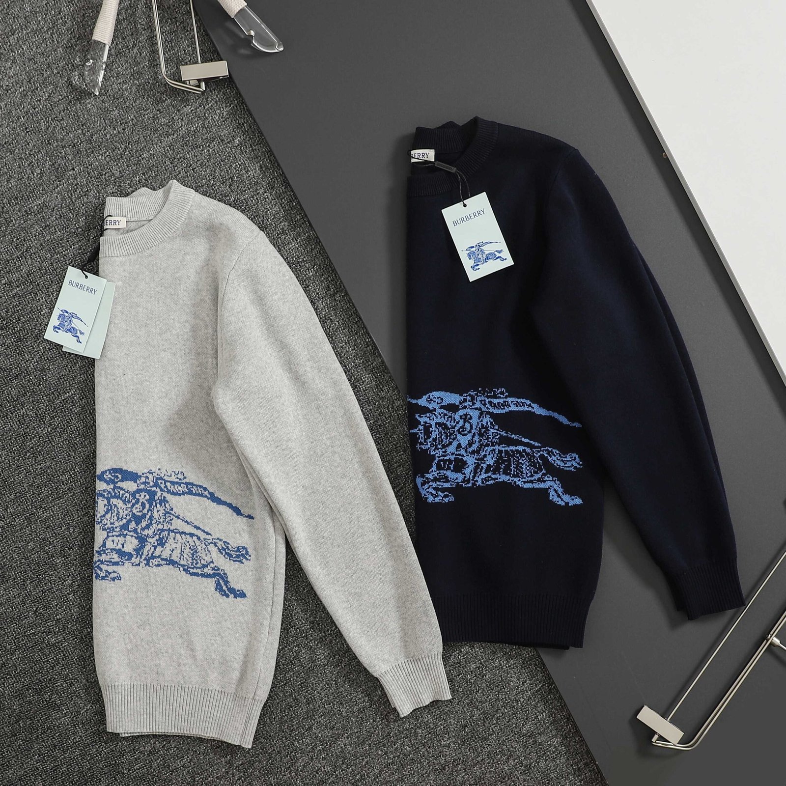 Pull Burberry en maille fine, orné du cavalier emblématique brodé en bleu sur le côté. Disponible en gris clair et en bleu marine, ce modèle associe confort et élégance.