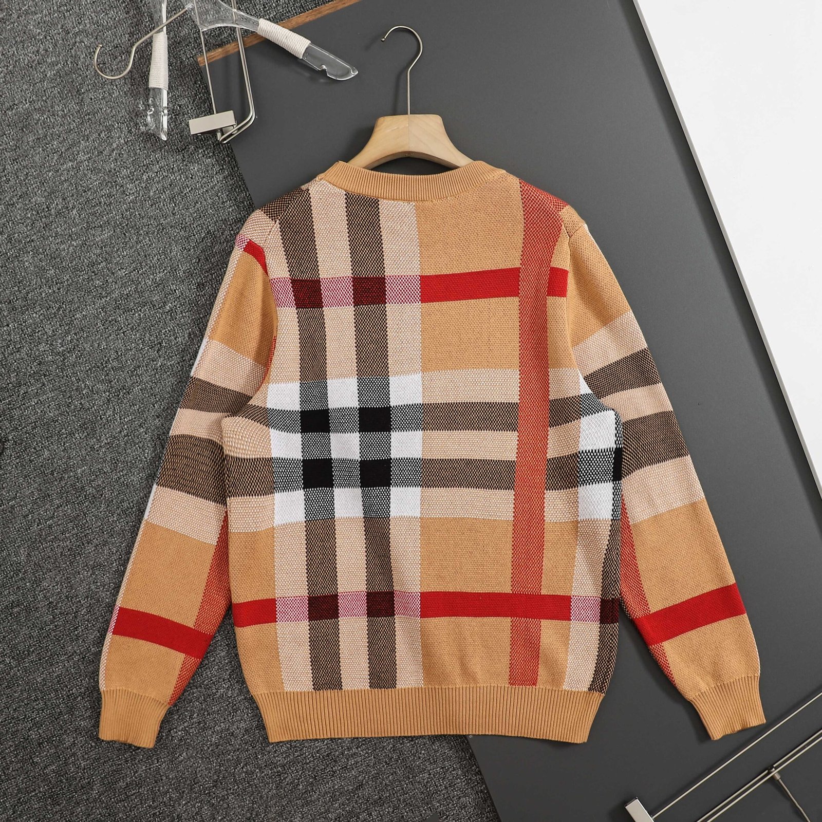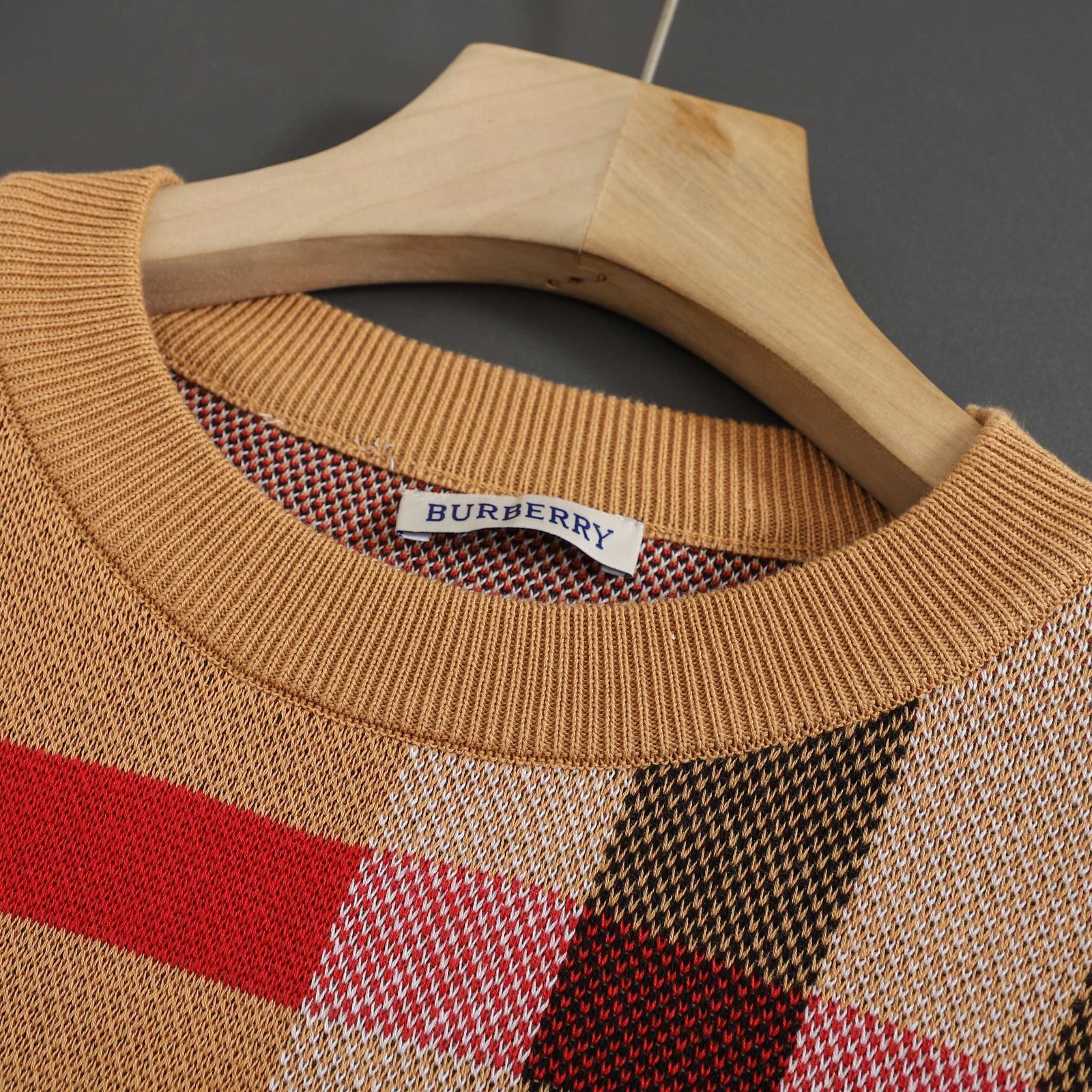 Pull Burberry à manches longues, arborant l’incontournable motif check dans des tons beiges, noirs, rouges et blancs. Un basique élégant et confortable signé Burberry.