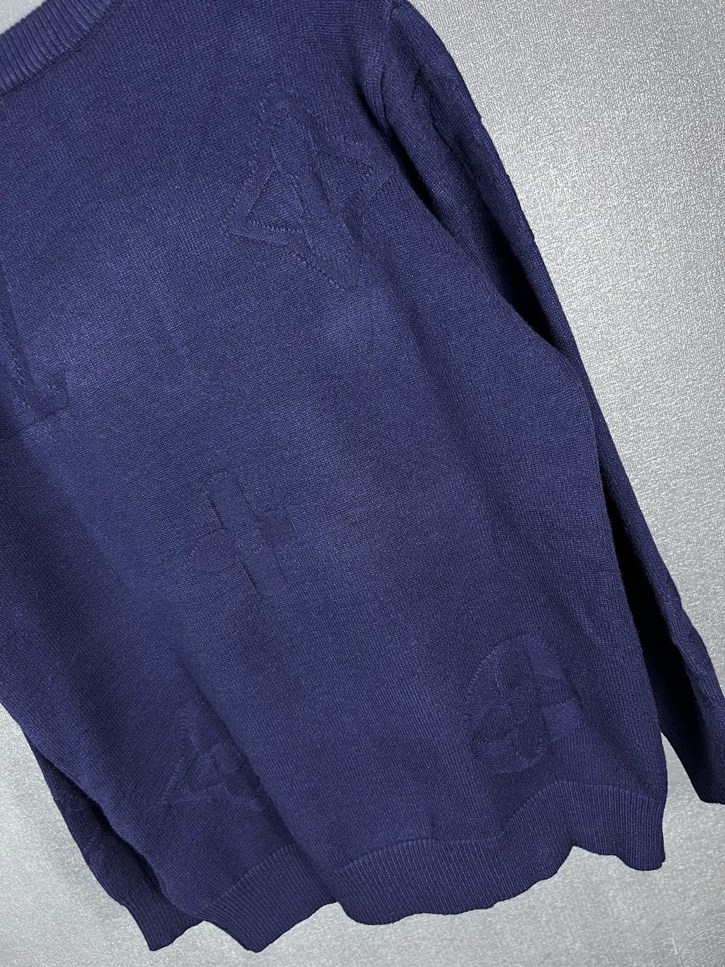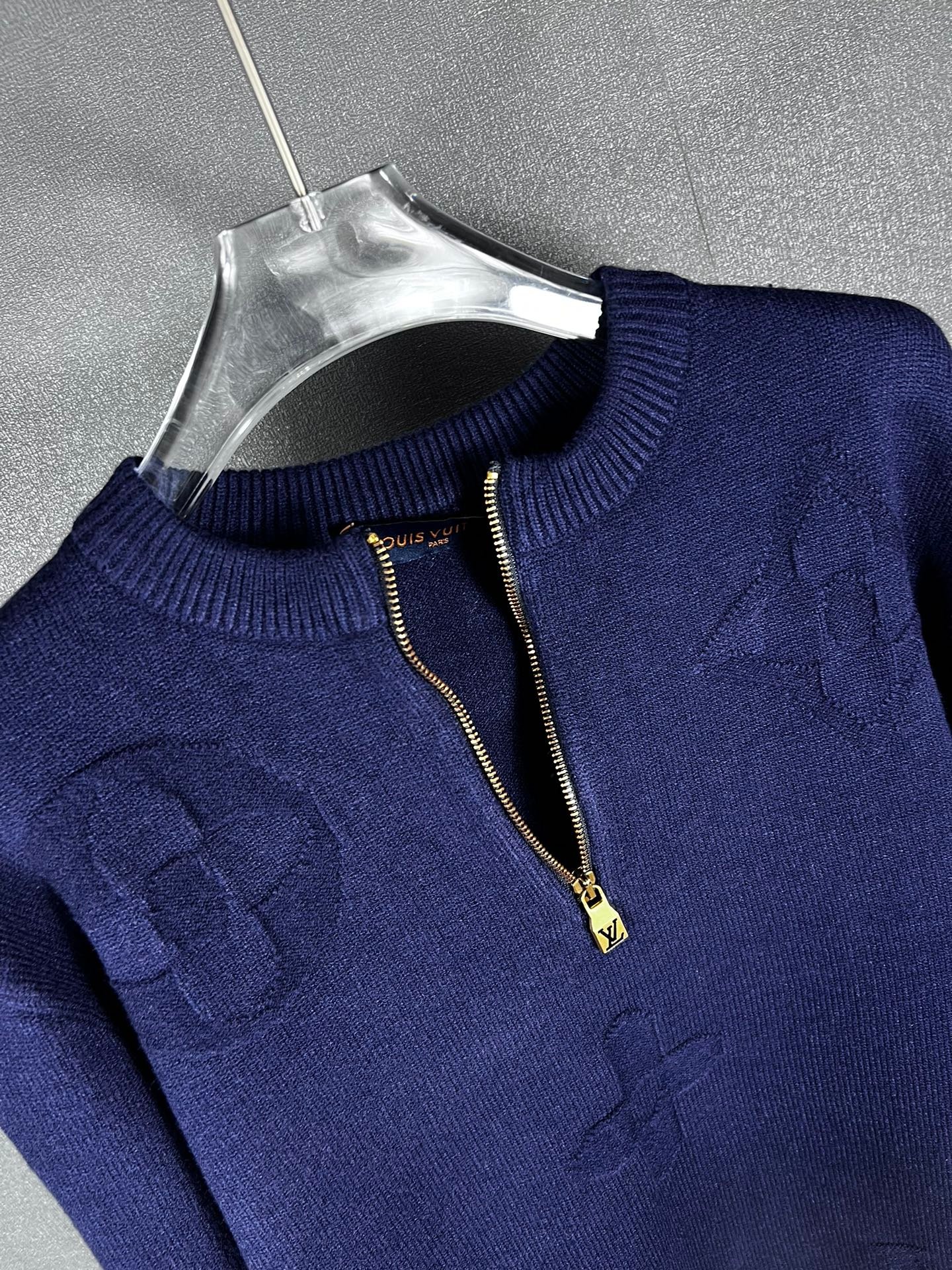 Pull Louis Vuitton en laine, demi-zip doré siglé LV, motifs monogrammes ton sur ton. Élégant et confortable, disponible en bleu ou gris.