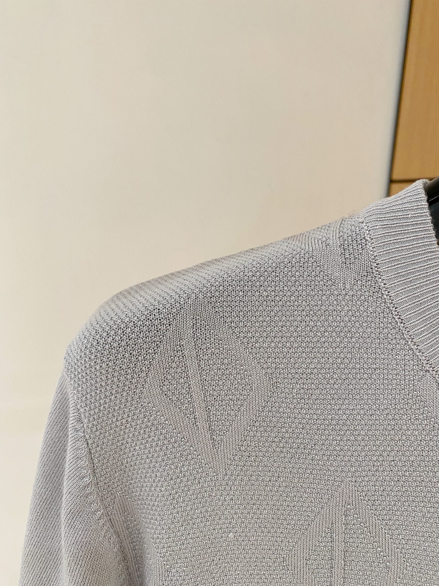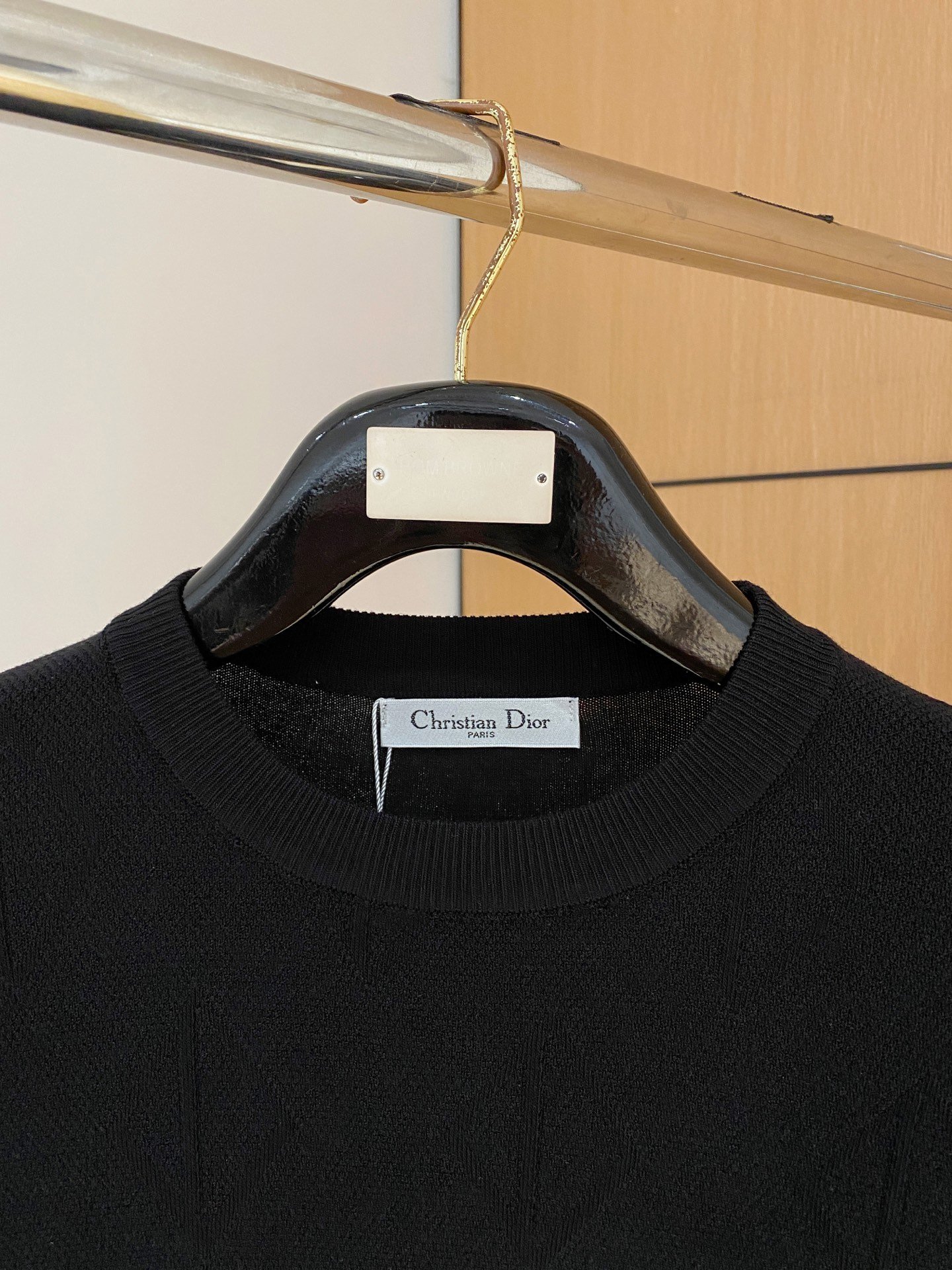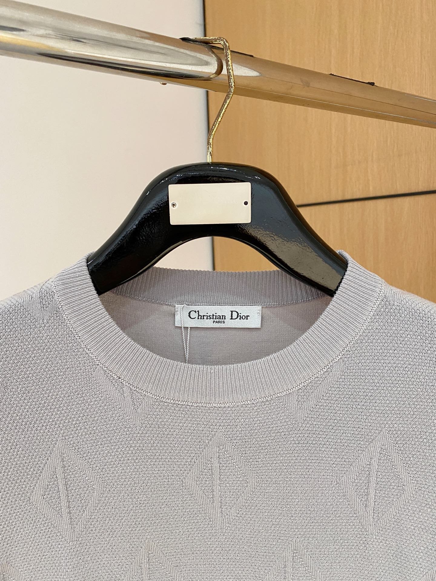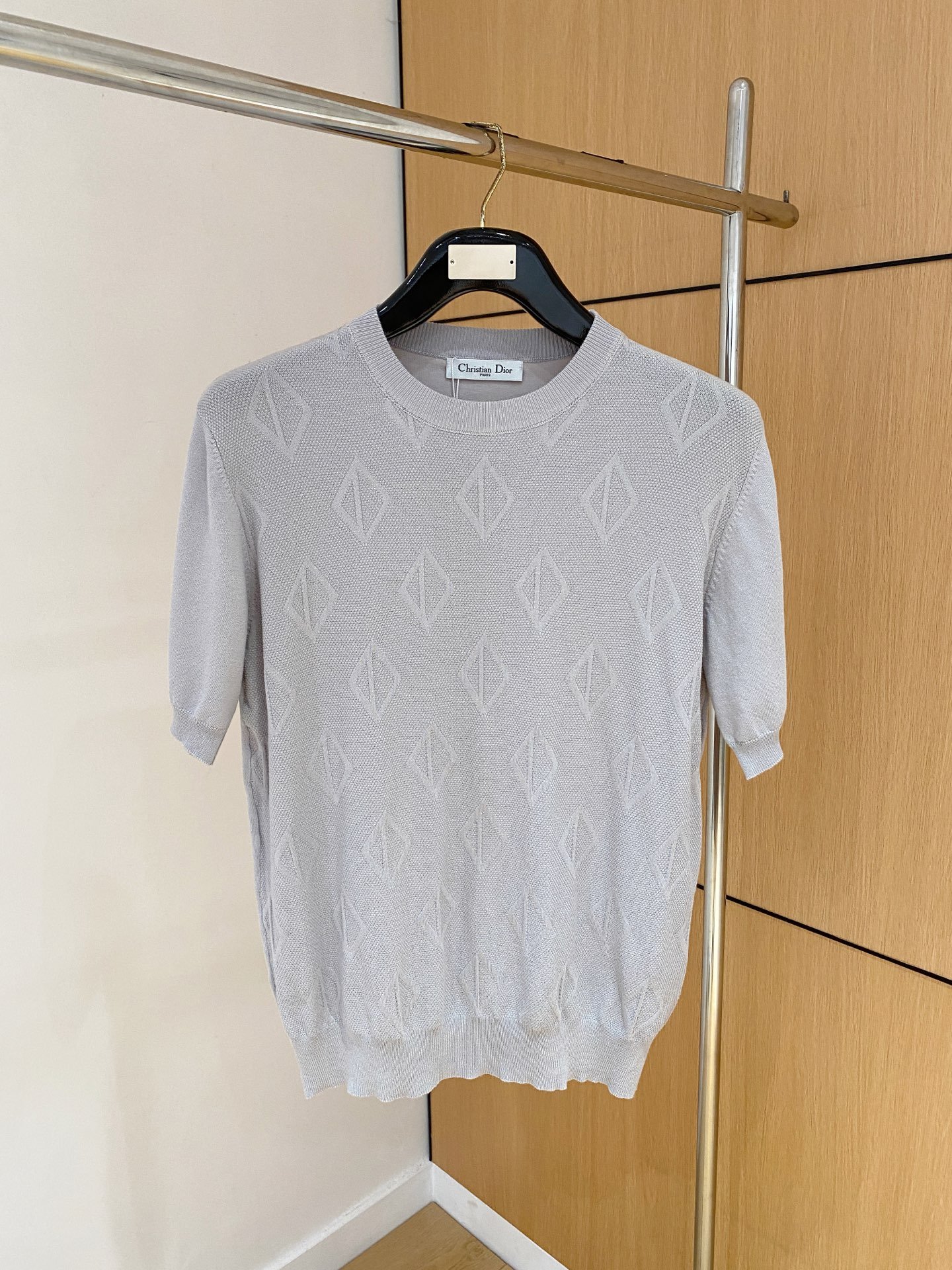 Pull Dior manches courtes en maille fine, motif géométrique discret, coupe chic et moderne.