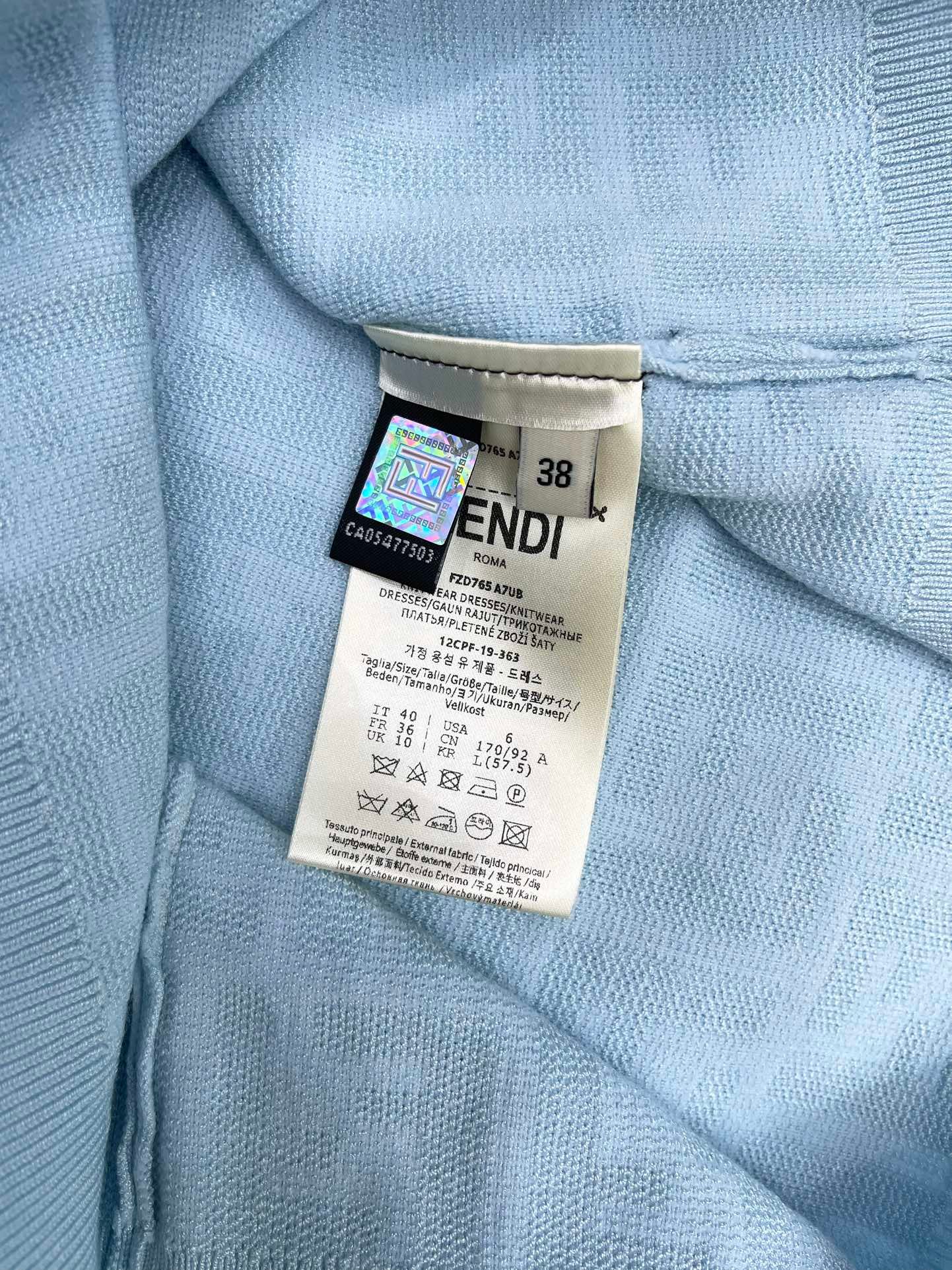 Élégante et intemporelle, cette robe Fendi en maille bleu clair arbore le célèbre motif FF en relief sur l’ensemble du tissu. Confectionnée en Italie dans une maille fine et légèrement extensible, elle épouse délicatement la silhouette tout en garantissant un confort optimal. Ses manches courtes et son col rond apportent une touche de modernité et de fraîcheur, idéale pour les journées estivales ou un look chic en toute simplicité.