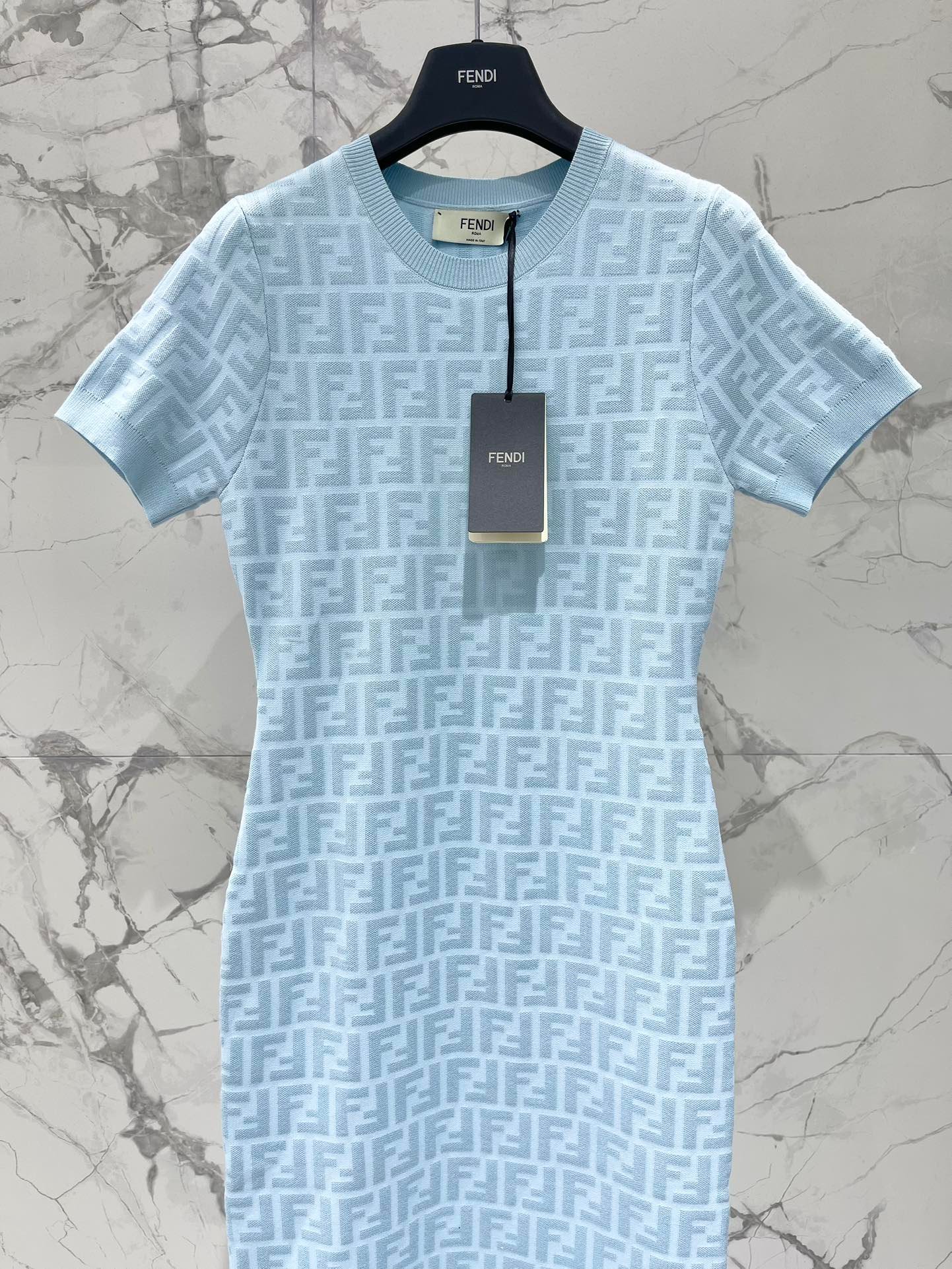 Robe Fendi en maille bleu clair, ornée du monogramme FF emblématique, manches courtes et coupe ajustée pour une allure raffinée et féminine.