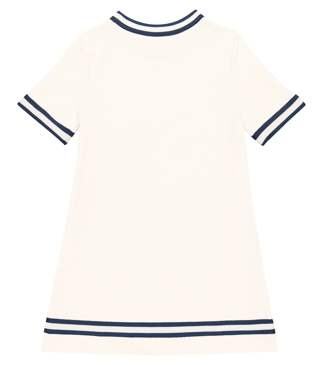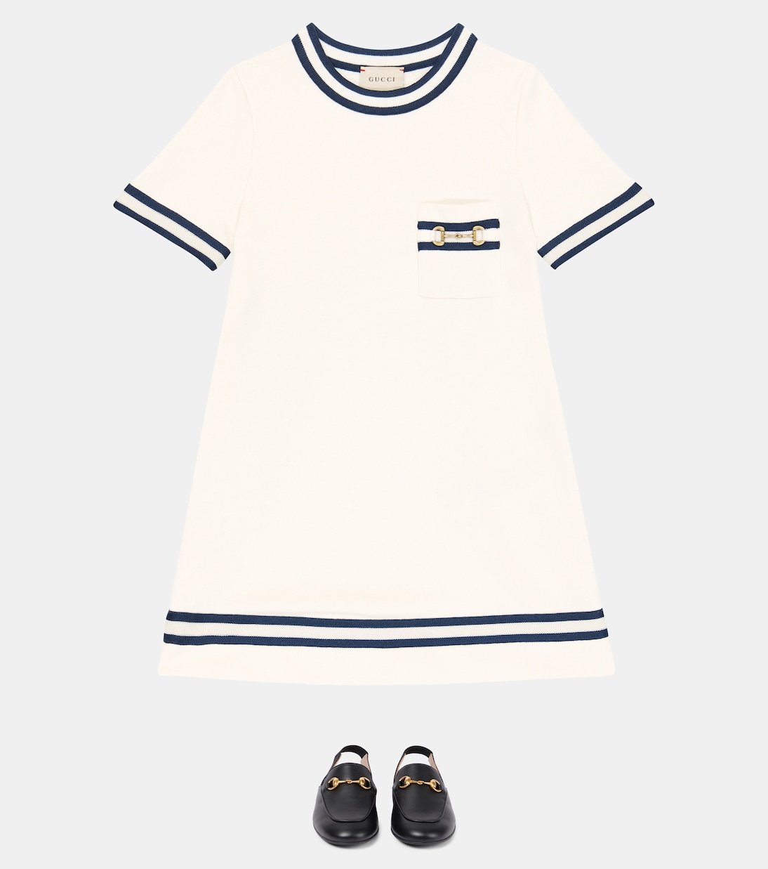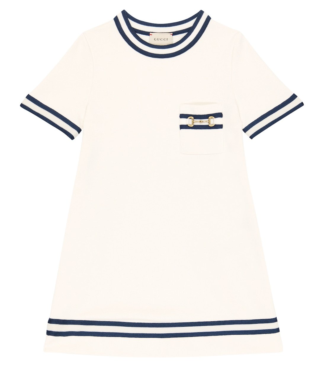 Cette robe en coton de Gucci Kids adopte une silhouette décontractée à manches courtes et à bords rayés et se pare de finitions métalliques Horsebit argentées sur la poche poitrine.