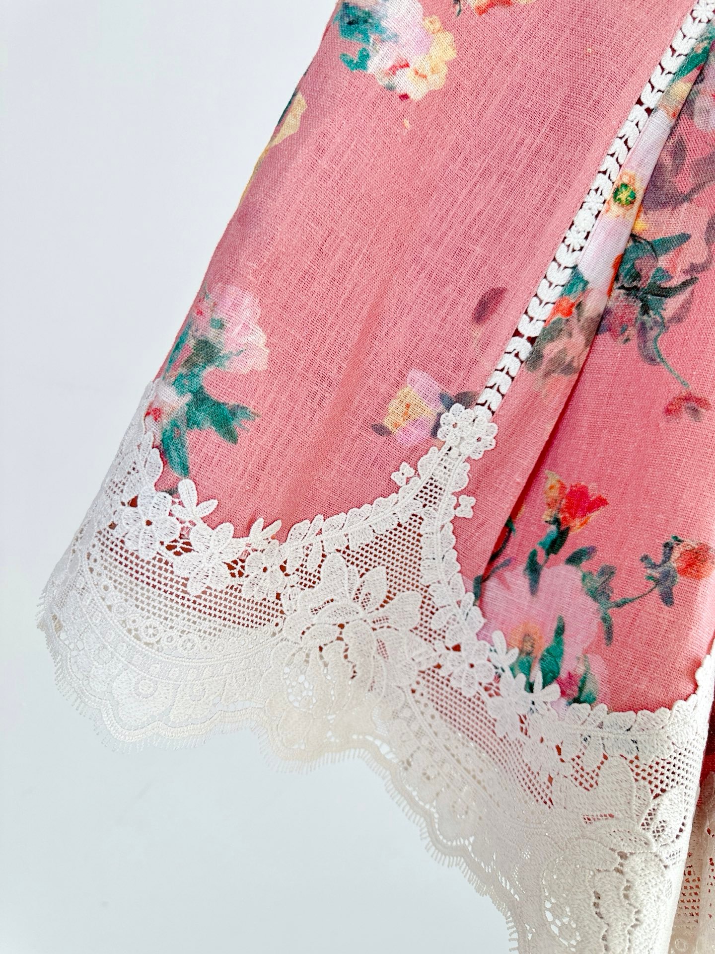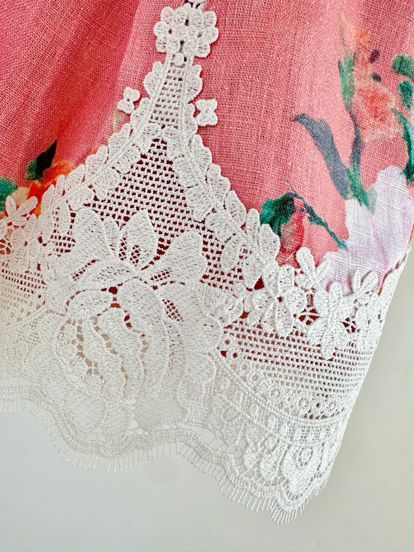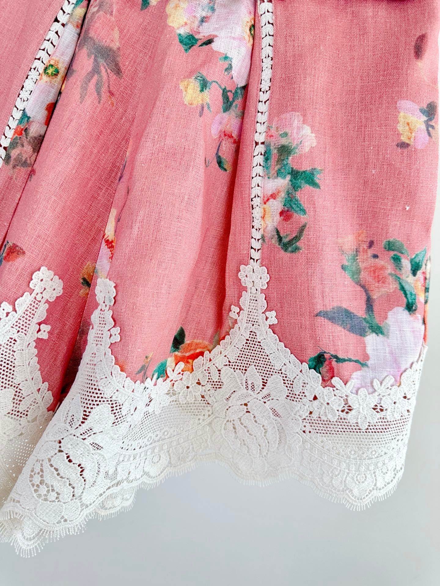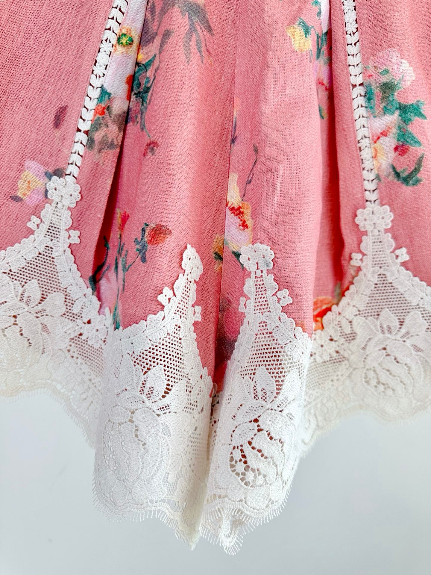 Robe short Zimmermann en tissu léger, sublimé par des bordures en dentelle délicate. Coupe féminine, taille élastique, parfait pour l’été et toutes occasions décontractées ou élégantes.
