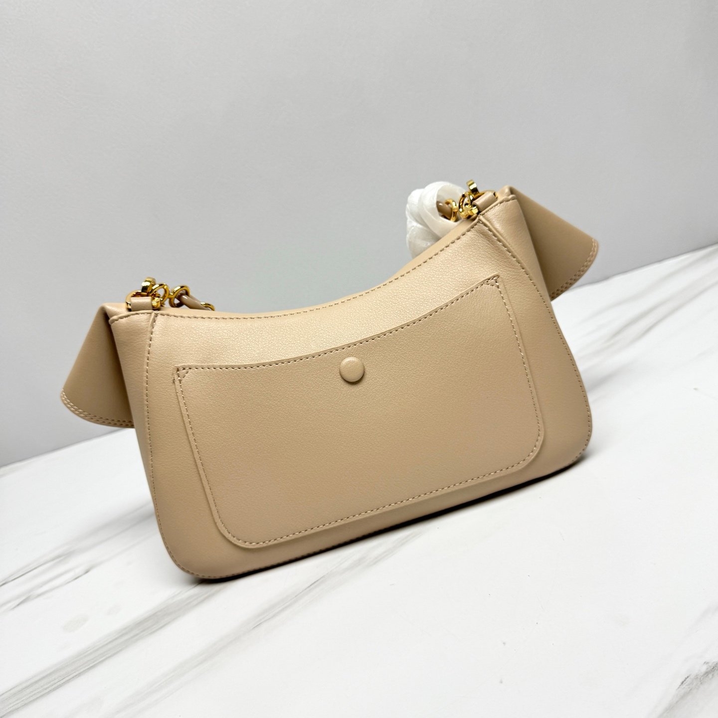 Chaque détail respire le raffinement : la finition mate du cuir contraste subtilement avec les éléments dorés brillants pour un rendu luxueux et sophistiqué.