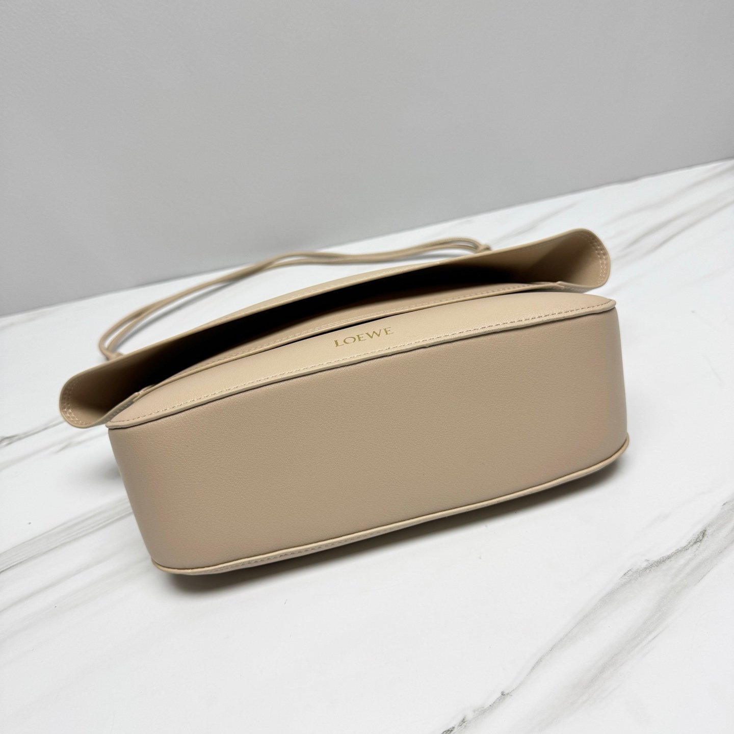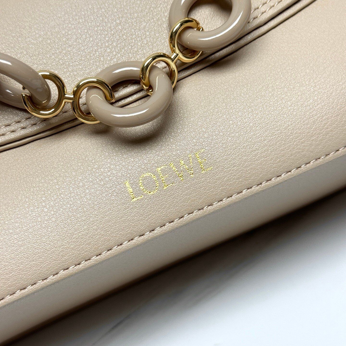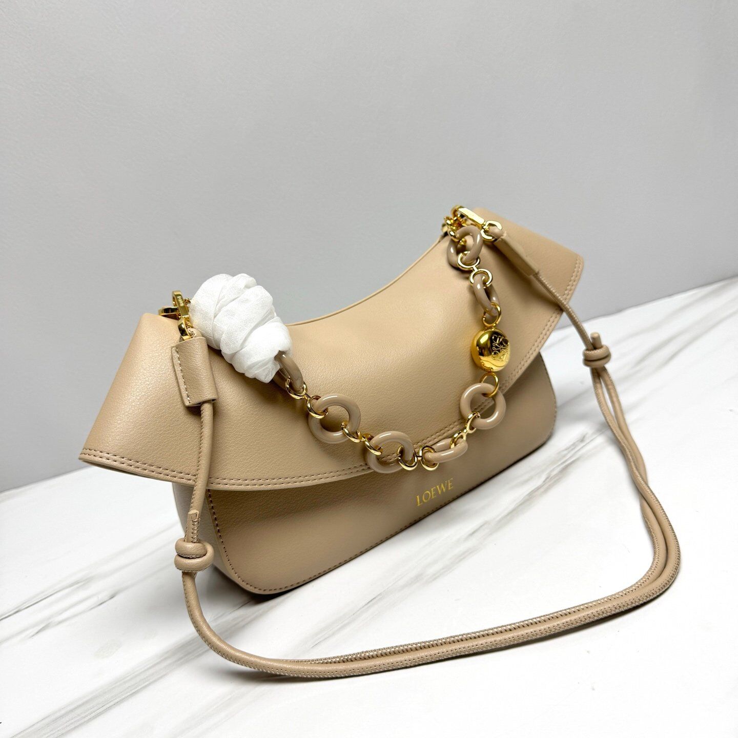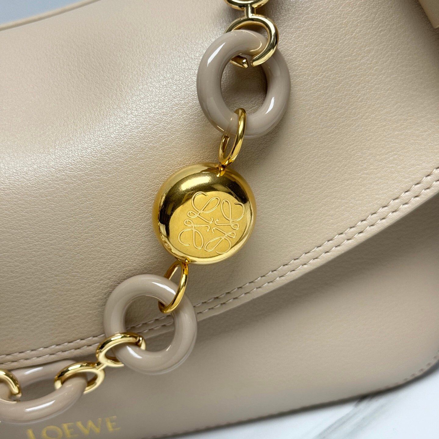 Ce sac à bandoulière beige signé LOEWE allie élégance intemporelle et modernité. Confectionné en cuir lisse haut de gamme, il se distingue par sa silhouette arrondie et sa chaîne dorée agrémentée de maillons en résine ton sur ton.