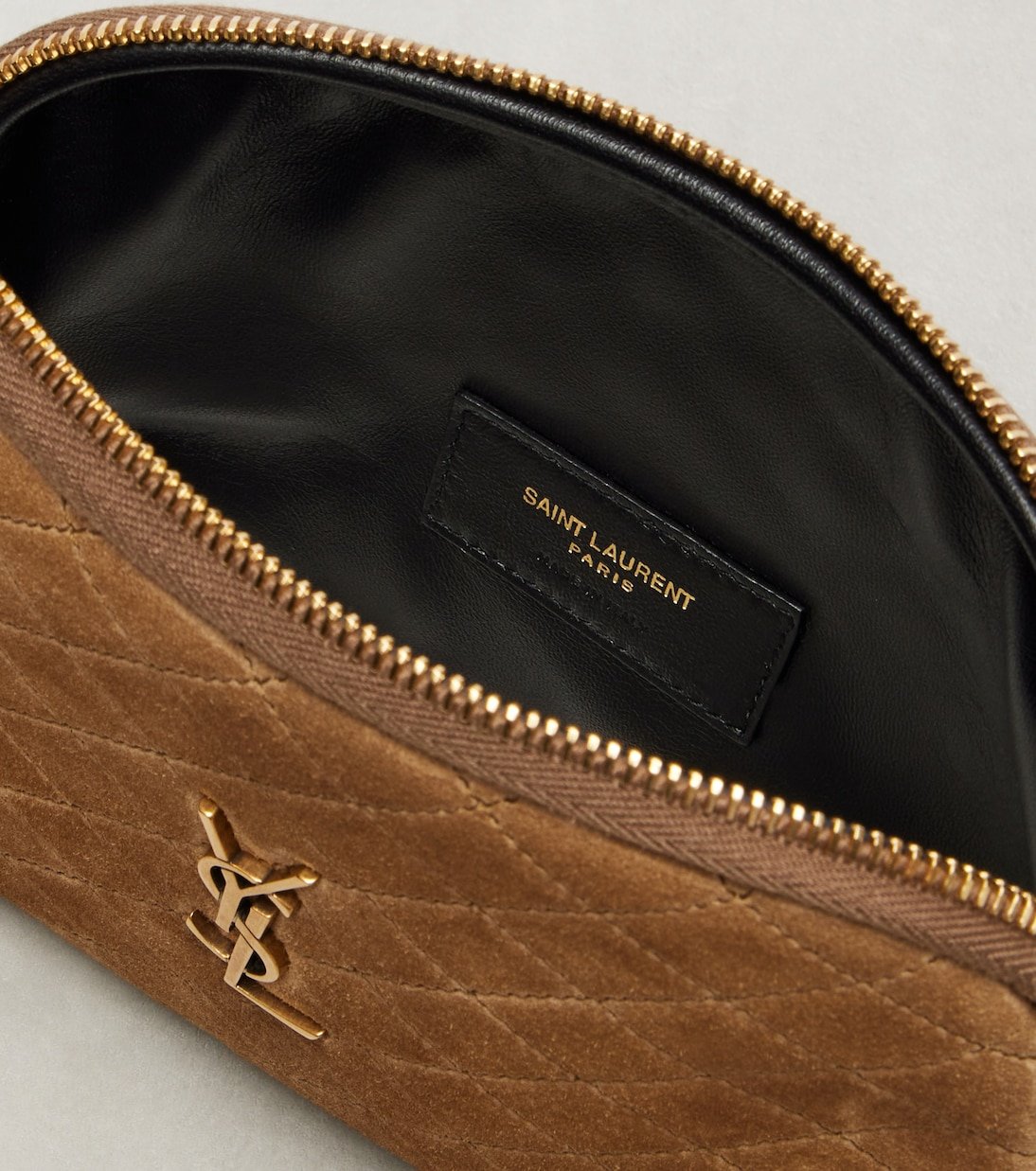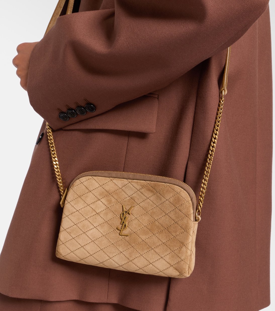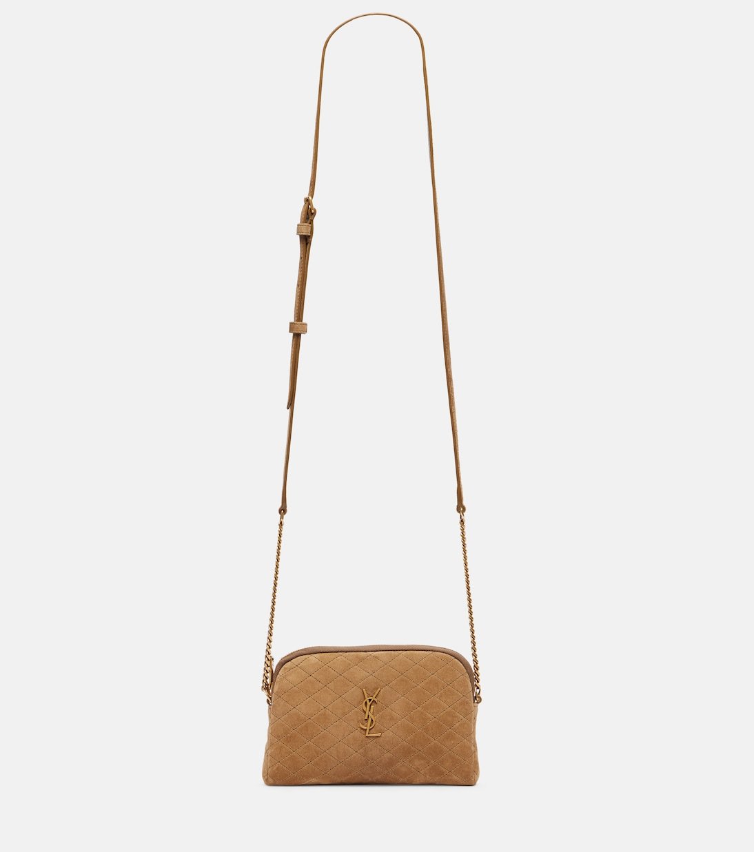 Modèle sophistiqué aux proportions compactes, le sac à bandoulière Gaby de Saint Laurent est confectionné en daim lisse avec un matelassage en losange. Ce modèle est doté d’une bandoulière réglable et du motif Cassandre de la maison sur le devant.