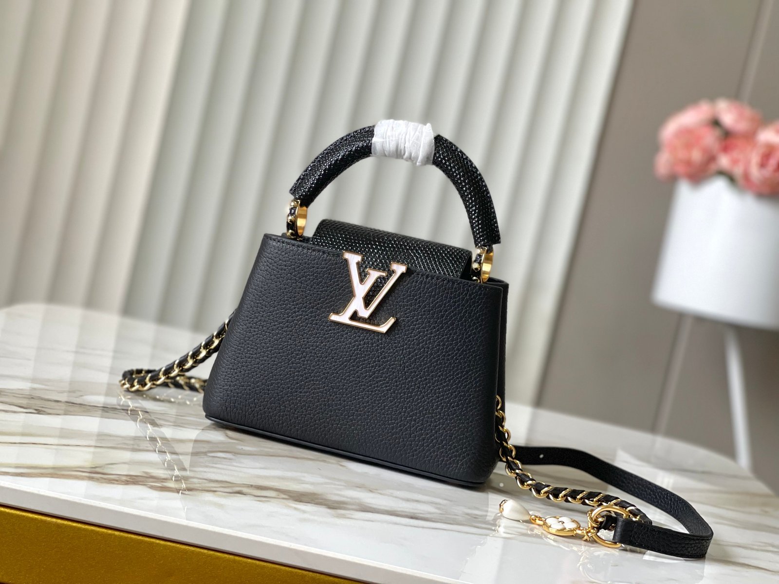 Découvrez l’élégance ultime avec le Sac Capucines Mini en cuir de luxe, un accessoire sophistiqué conçu pour celles qui recherchent la combinaison parfaite entre style raffiné et praticité. Sa taille compacte en fait le compagnon idéal pour toutes les occasions, tout en apportant une touche de distinction à votre tenue.