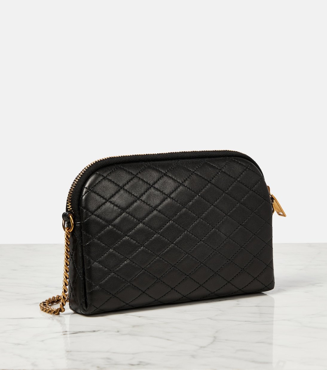 Le modèle Gaby emblématique de Saint Laurent est revisité avec ce sac à matelassage carré. Suspendu à une chaîne dorée réglable, ce modèle zippé réalisé en cuir revêt un monogramme métallique.