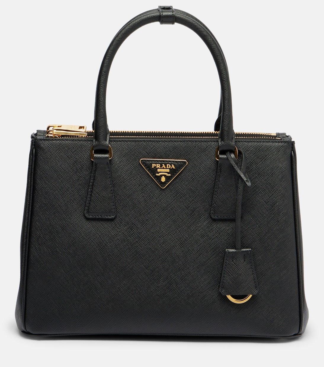 Le sac Galleria Medium de Prada est réalisé en cuir Saffanio, défini par une texture hachurée. Ce modèle arbore le logo triangulaire de la maison en métal, des poignées supérieures et un porte-clés en cuir amovible.
