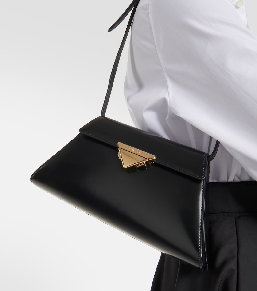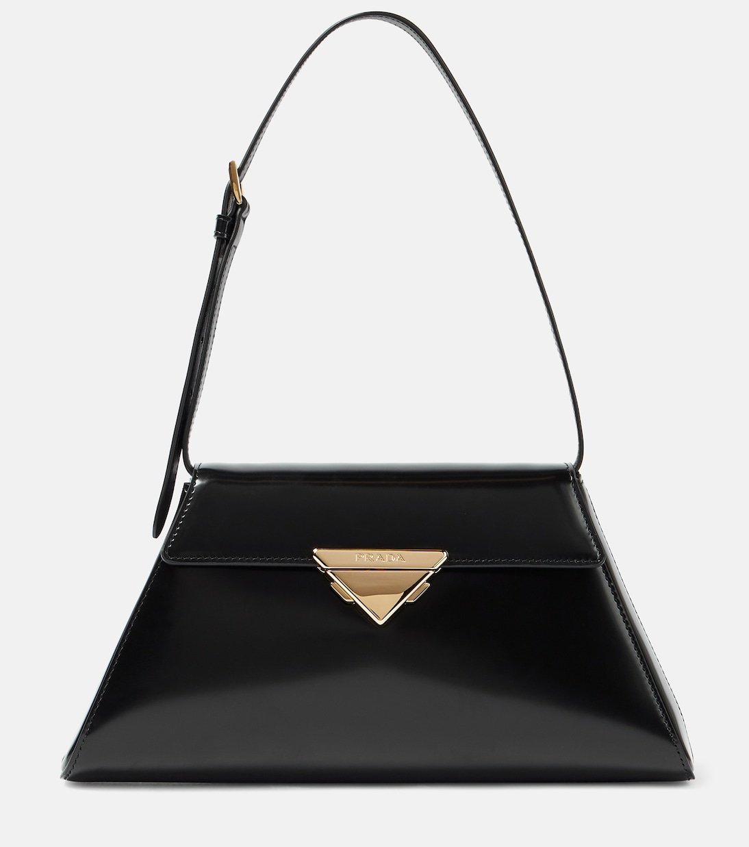 Le logo triangulaire de Prada rend hommage à la relation de longue date entre le label et la famille royale italienne, la maison de Savoie. On le retrouve sous la forme d’un fermoir sur ce sac Medium en cuir noir brossé affichant une coupe trapèze.