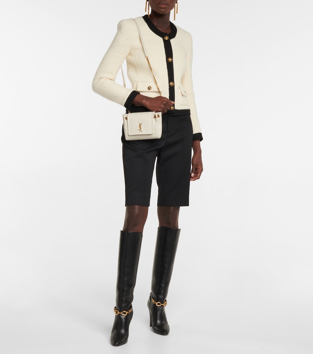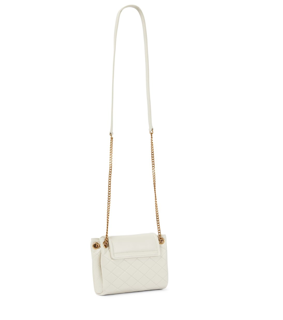 Saint Laurent illustre son savoir-faire d’exception en matière d’accessoires avec le sac Mini Nolita. Habillé de cuir véritable à matelassage en losange, il se distingue par son monogramme YSL en métal doré ainsi que par sa bandoulière en chaîne et cuir pour un porté épaule ou croisé.