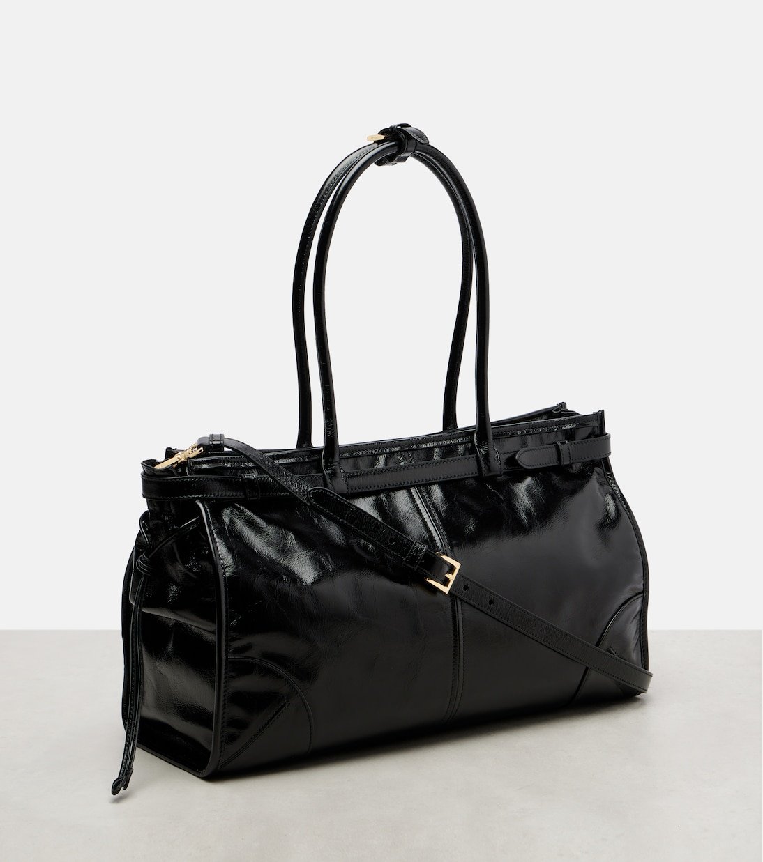 Confectionné en cuir brillant, le sac Bonnie Large présente une silhouette allongée, une boucle et un logo triangulaire emblématique. Prada revisite l’héritage italien dans une direction résolument moderne avec une approche épurée et avant-gardiste.