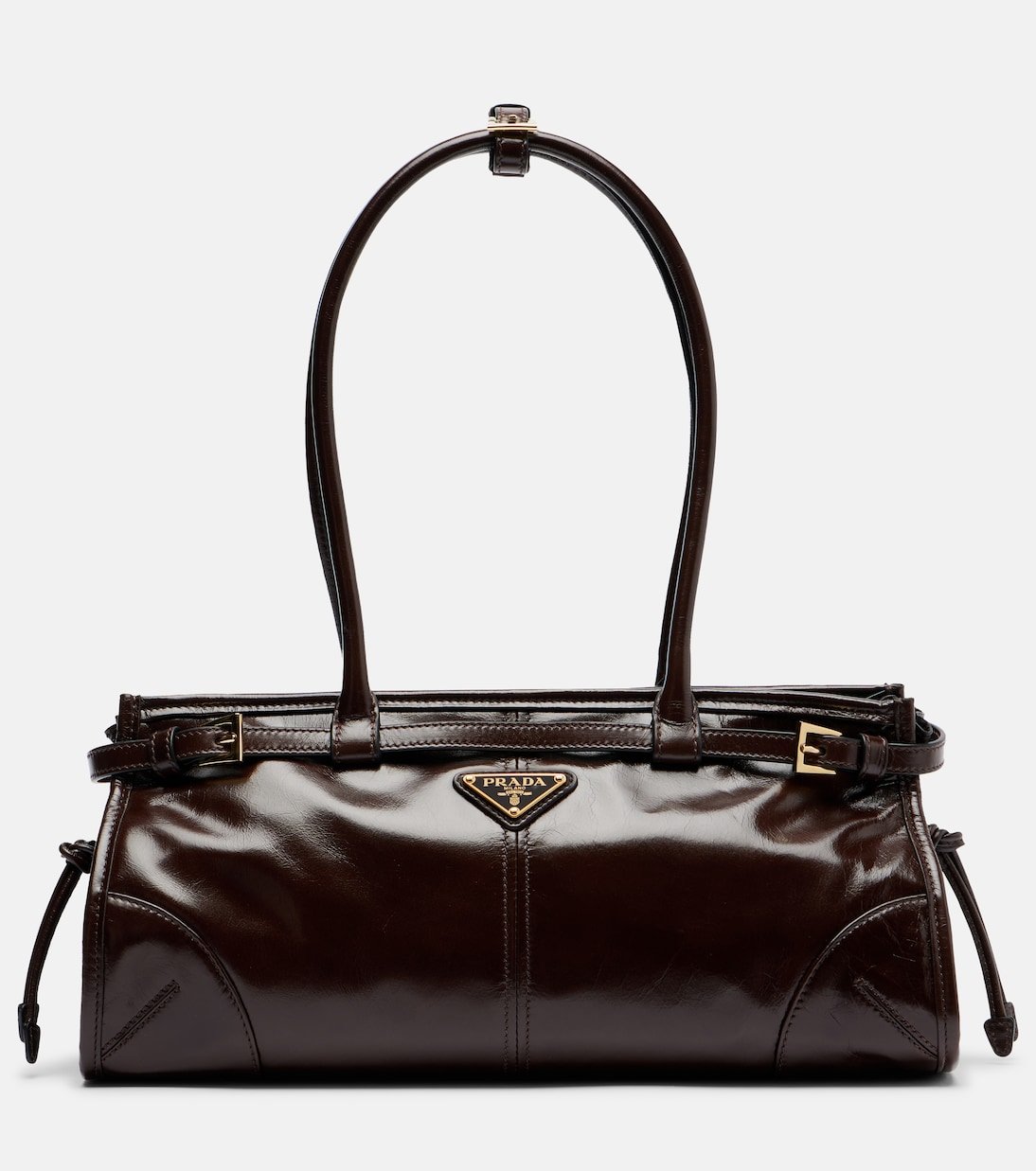 Confectionné en cuir brillant, le sac Prada Bonnie Medium présente une silhouette allongée, une boucle et un logo triangulaire emblématique. Prada revisite l’héritage italien dans une direction résolument moderne avec une approche épurée et avant-gardiste.