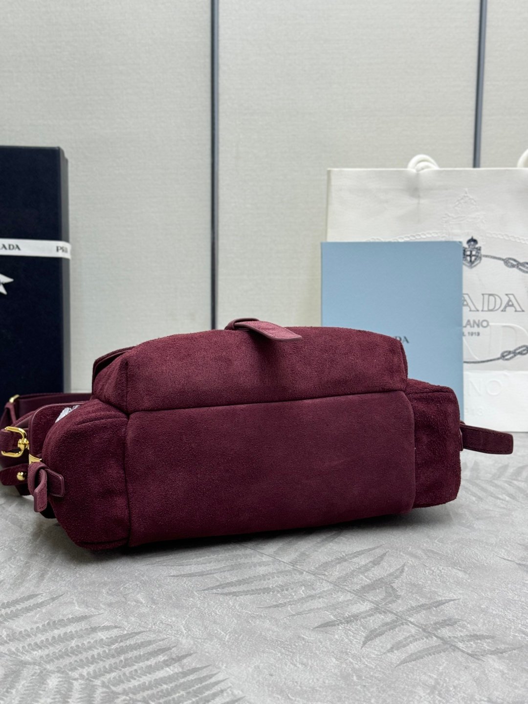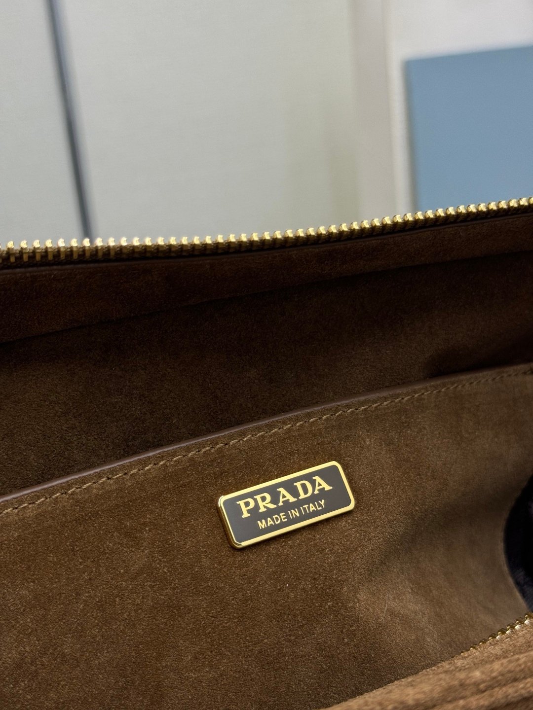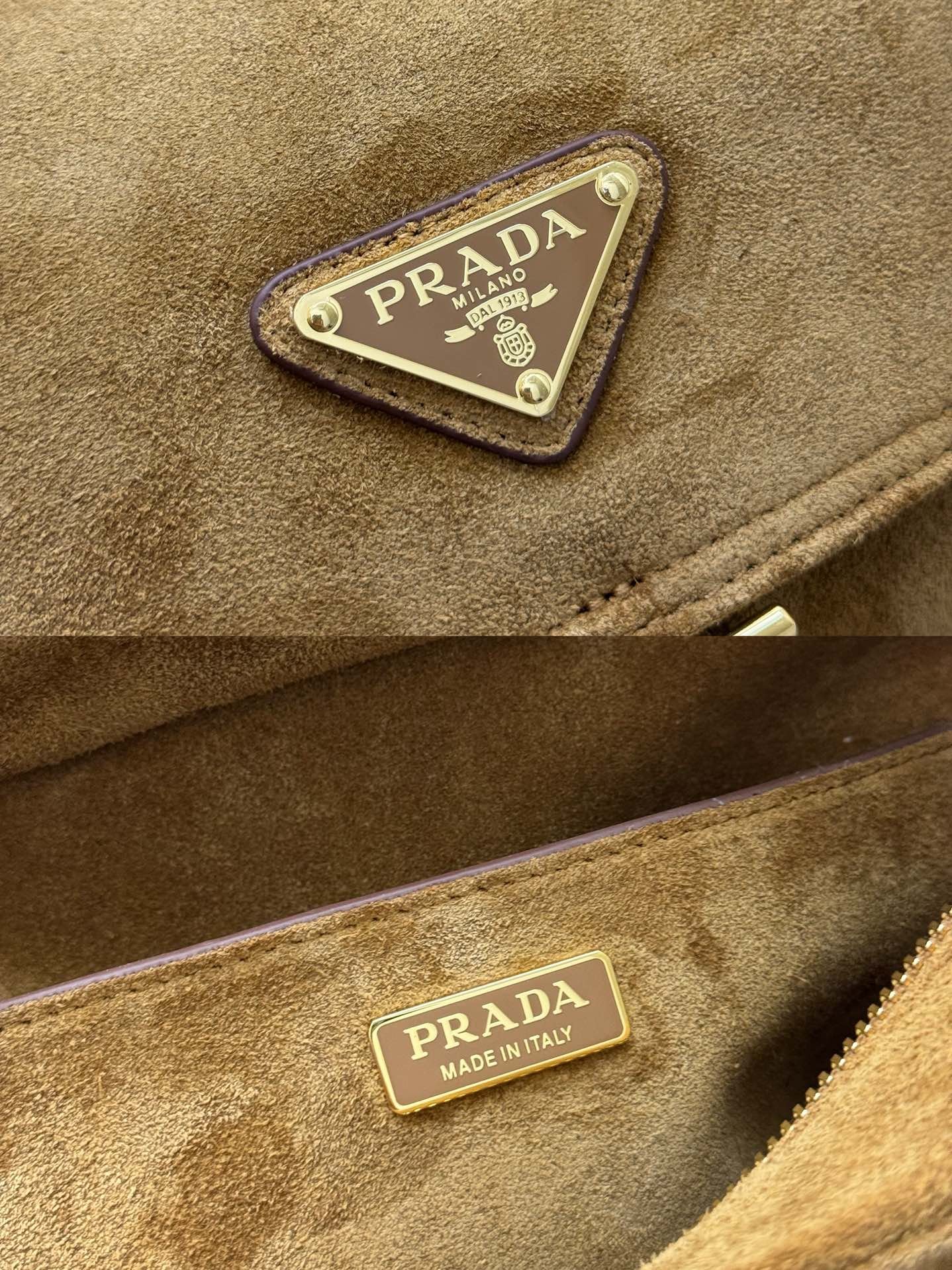 Ce sac Prada en daim est un indispensable de la maroquinerie de luxe, idéal pour affirmer une allure sophistiquée avec modernité.