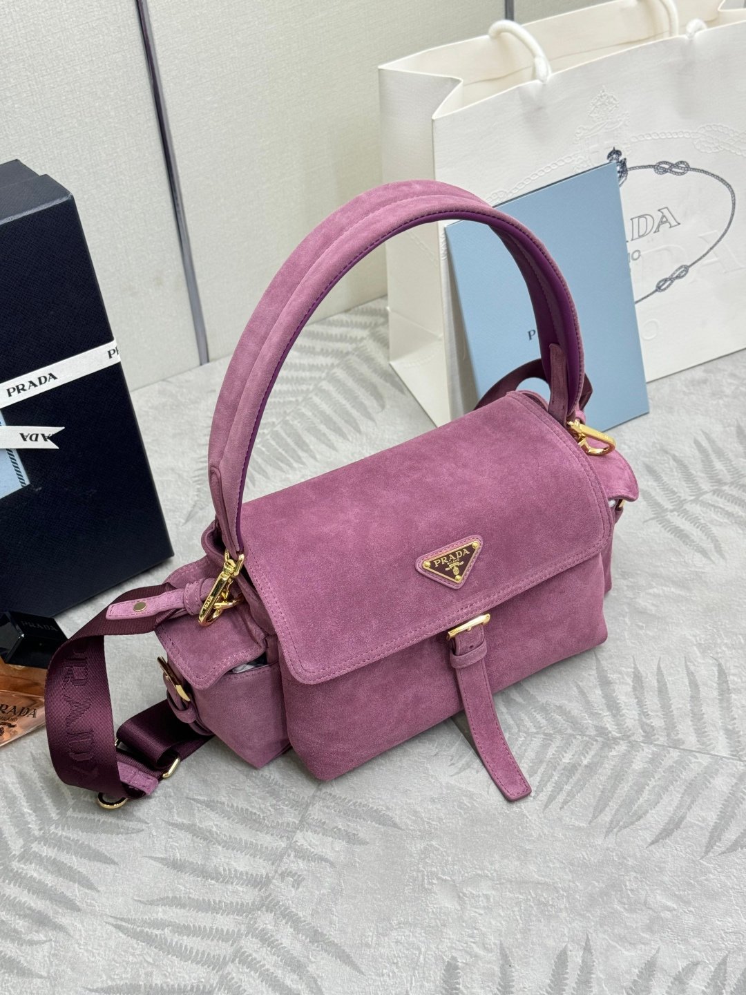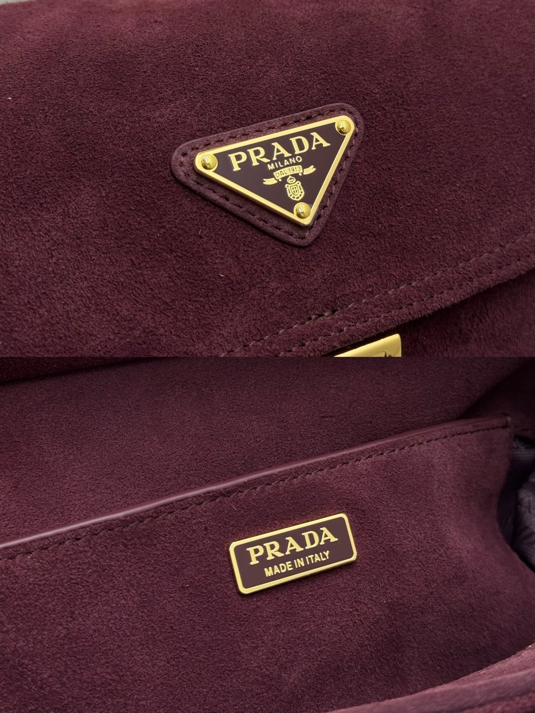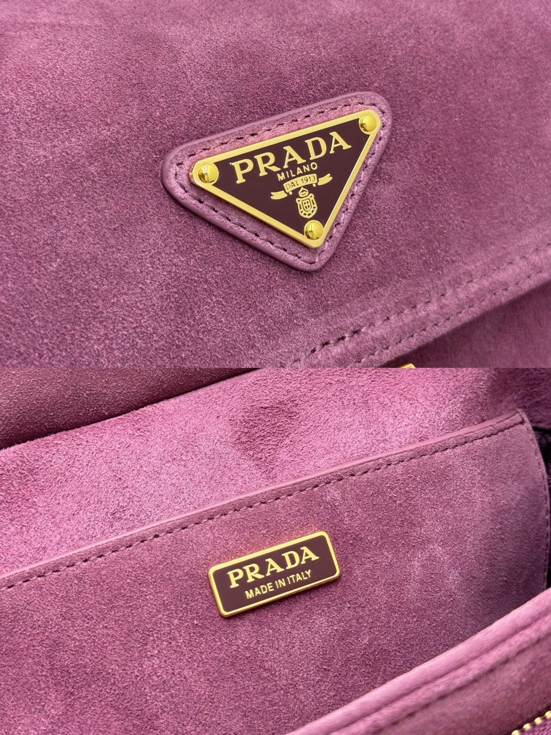 Sac Prada en daim au design iconique avec rabat et finitions dorées.