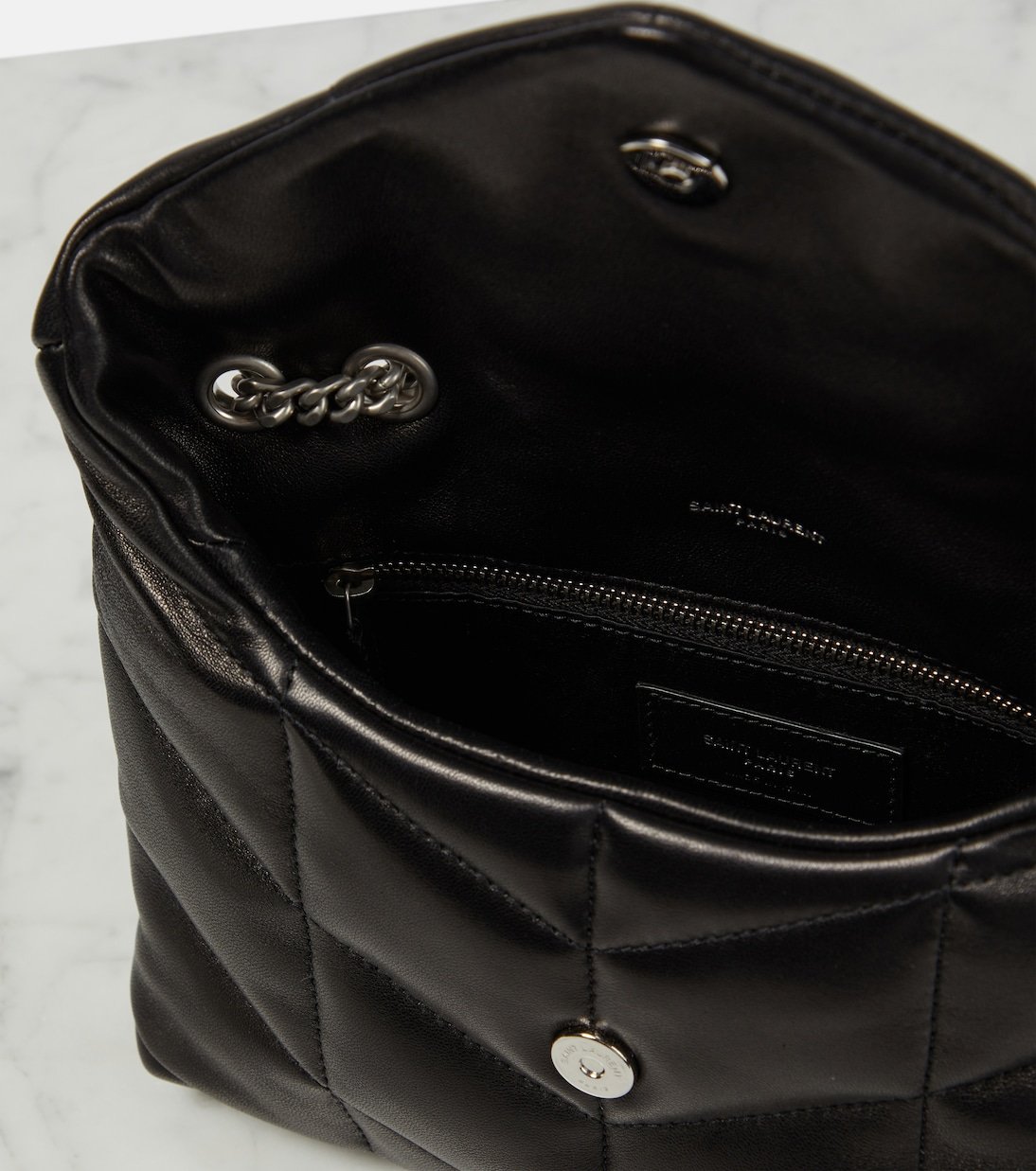 Version revisitée du modèle Loulou, le sac en cuir Puffer Toy de Saint Laurent est doté d’un extérieur légèrement rembourré et présente un matelassage à chevrons signature. Ce modèle confectionné en Italie s’accompagne d’une bandoulière chaîne et de l’emblématique monogramme YSL argenté.