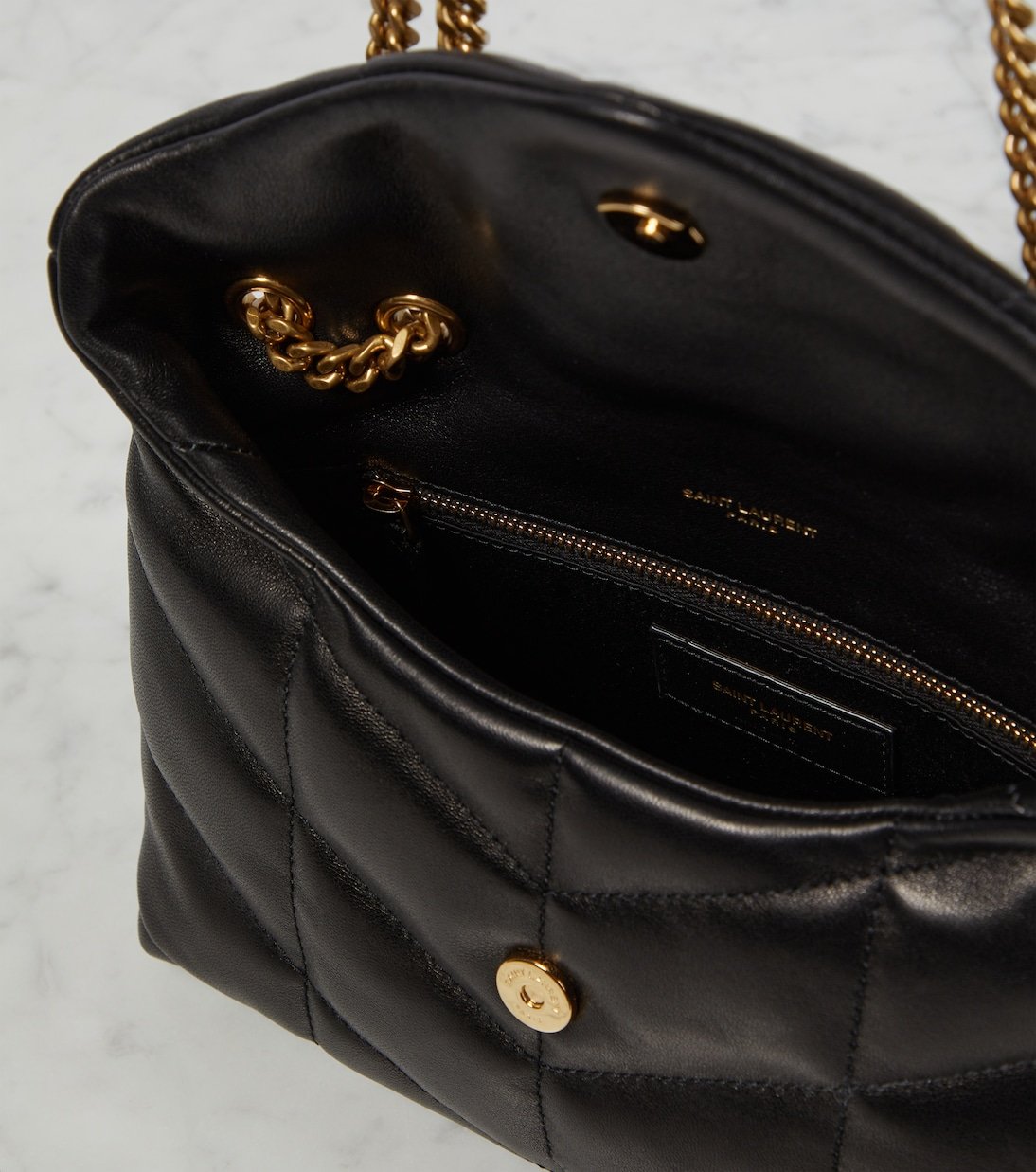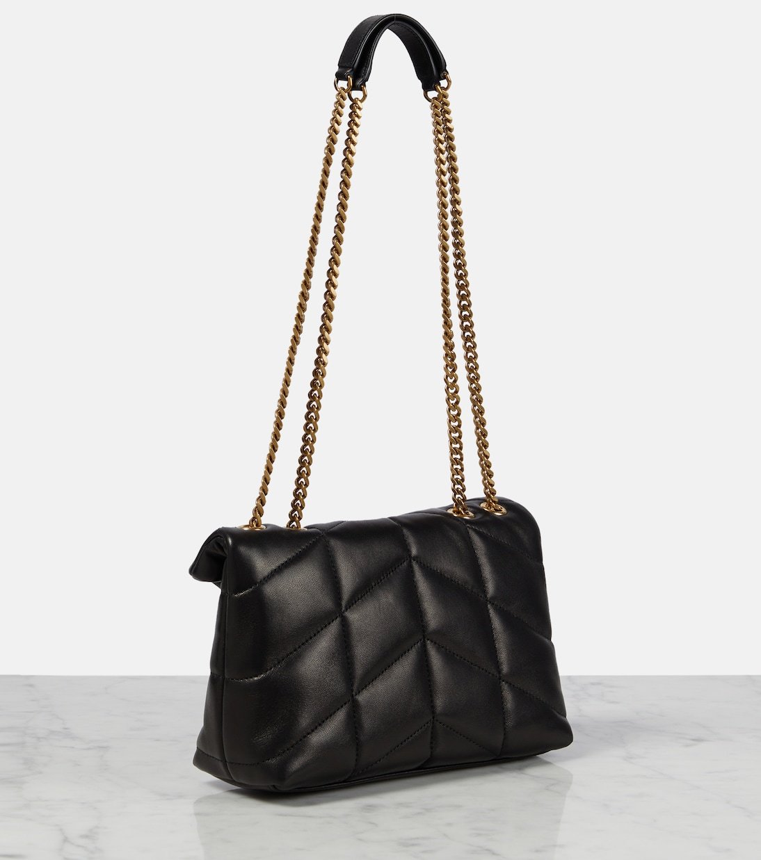 Version revisitée du modèle Loulou, le sac Puffer Toy de Saint Laurent est doté d’un extérieur légèrement rembourré et d’un matelassage à chevrons signature.