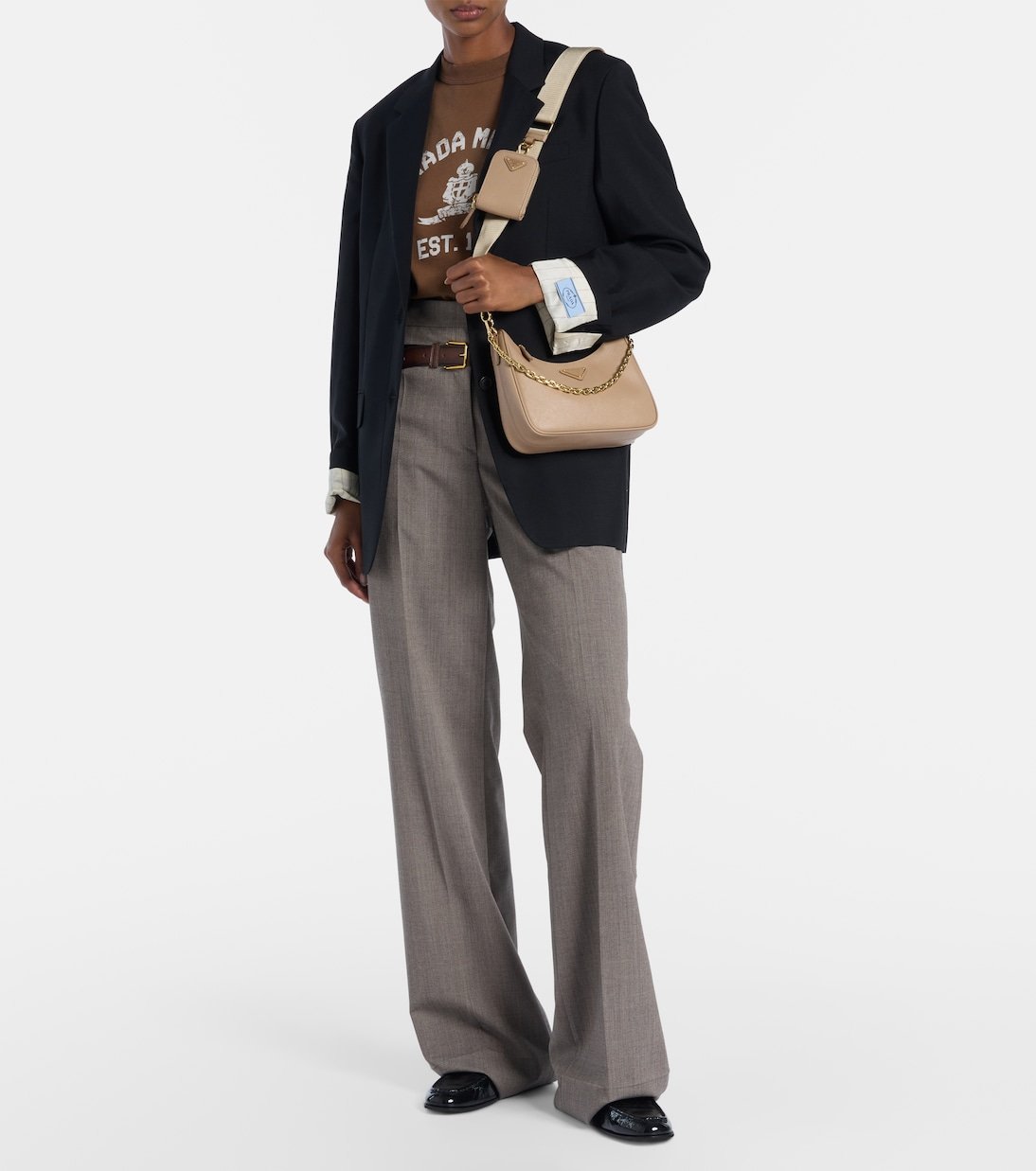 Prada revisite l’héritage italien dans une direction résolument moderne avec une approche épurée et avant-gardiste. Réalisé en cuir beige, le sac Re-Edition 2005 est agrémenté d’une pochette zippée assortie, de finitions métalliques dorées et d’une bandoulière chaîne amovible.