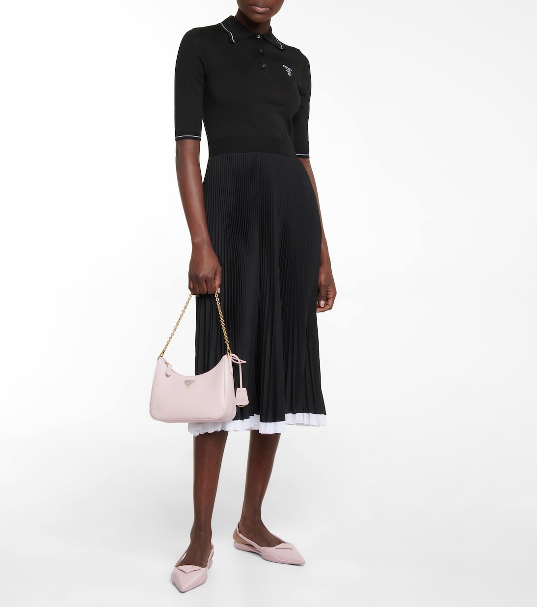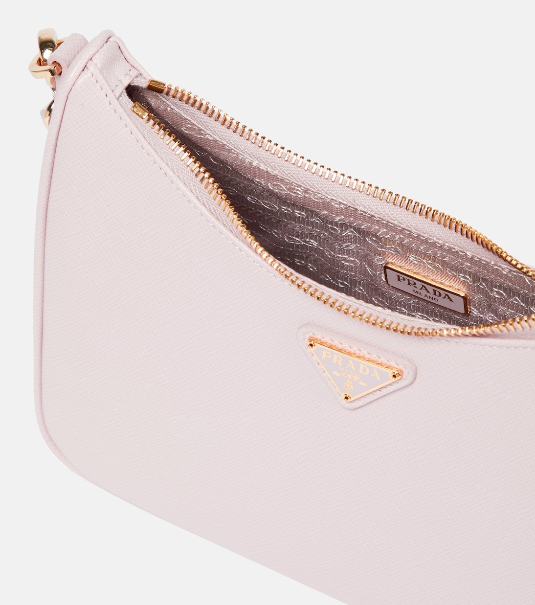 Le sac Re-Edition de Prada revisite le modèle issu des archives de 2005 en cuir Saffiano. Cette version rose se dote d’une bandoulière en chaîne dorée amovible et d’une sangle réglable. La pochette amovible et le porte-clés sont des caractéristiques pratiques que les adeptes de Prada apprécieront.
