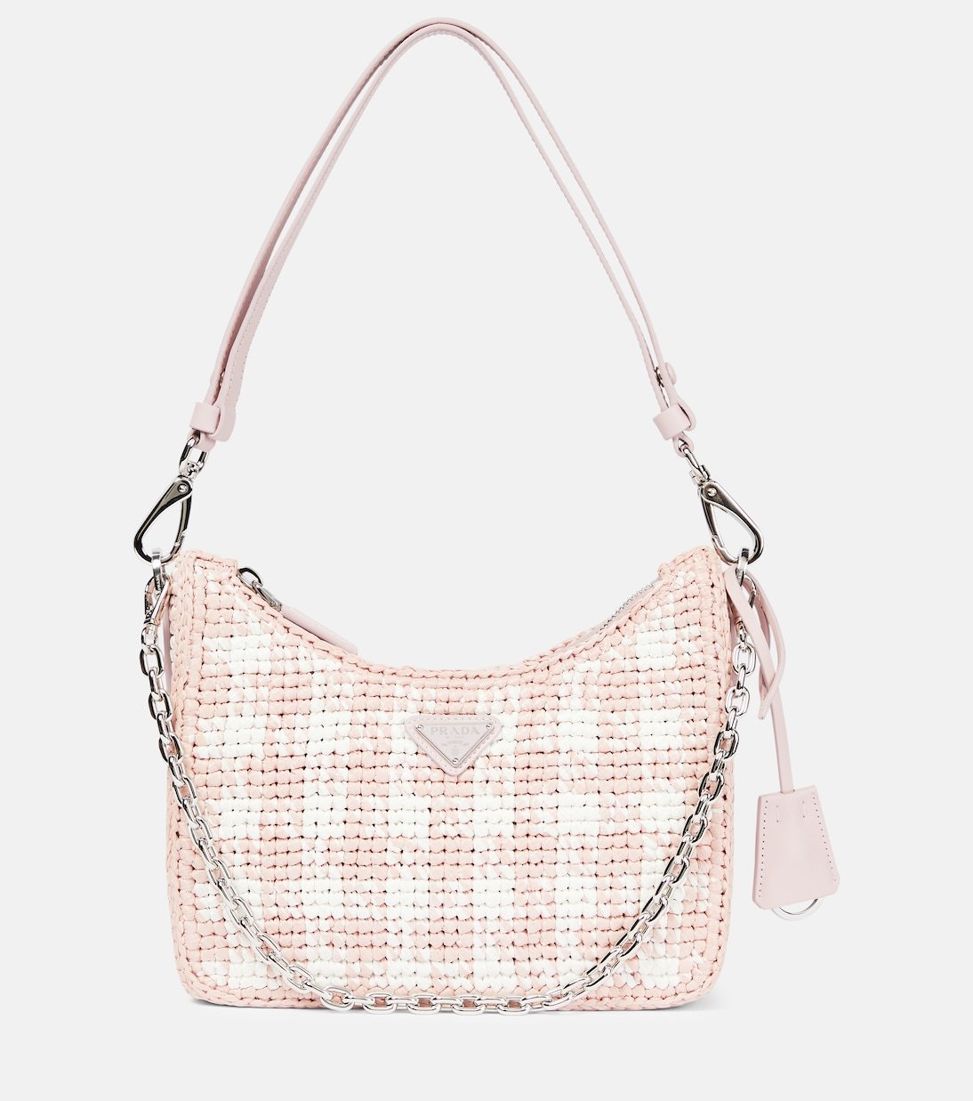 Tissée en raphia et rehaussée de carreaux, cette version de l’iconique sac Re-Edition de Prada revêt une teinte pastel estivale. Ce modèle porté épaule possède une fermeture zippée, un porte-clé amovible et une plaque triangulaire à logo.