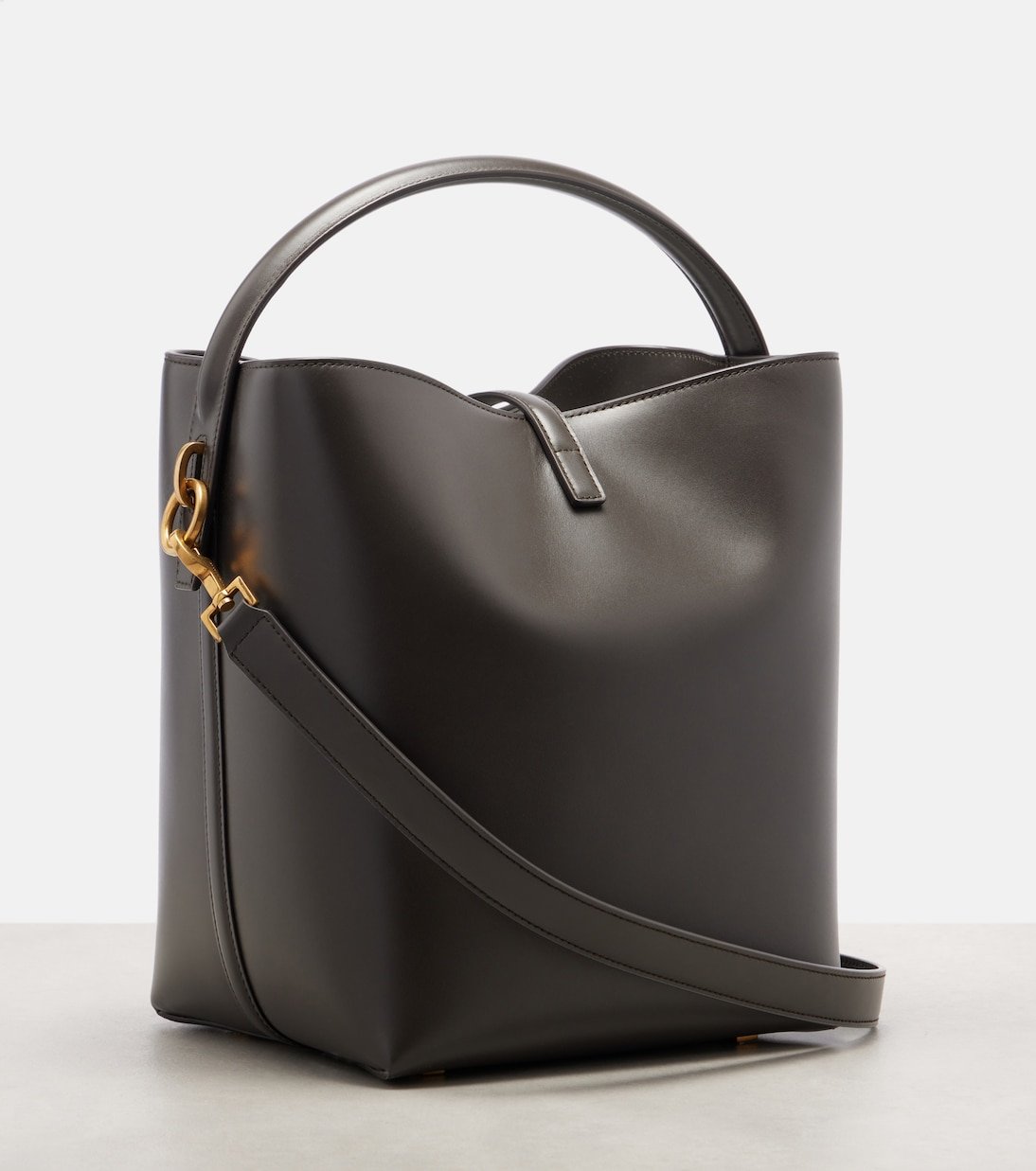 Le monogramme YSL, l’un des symboles les plus célèbres de la mode, se compose des initiales entremêlées du fondateur de Saint Laurent. Ici en doré, c’est la boucle du sac seau Le 37 Cassandre.