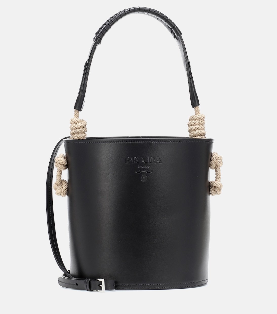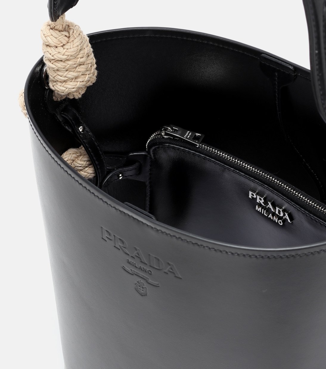 Prada allie élégance et rigueur avec le sac seau Tambour noir. Confectionné en cuir en Italie, il séduit par ses finitions en corde tressée, qui confèrent un charme artisanal à ce modèle luxueux. Sécurisez vos essentiels grâce à sa pochette zippée interne et portez-le au bras ou par sa bandoulière avec vos tenues les plus pointues.
