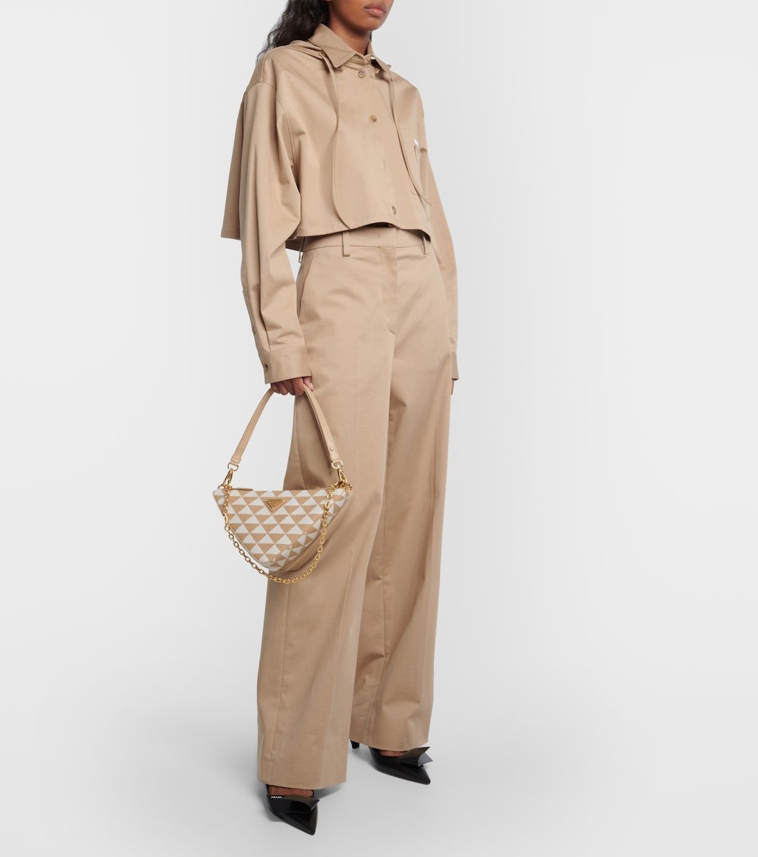 Le sac en cuir Symbole reprend la silhouette géométrique emblématique de Prada. Il arbore le logo triangulaire en métal émaillé sur le devant, créant un jeu de textures avec une bandoulière amovible.