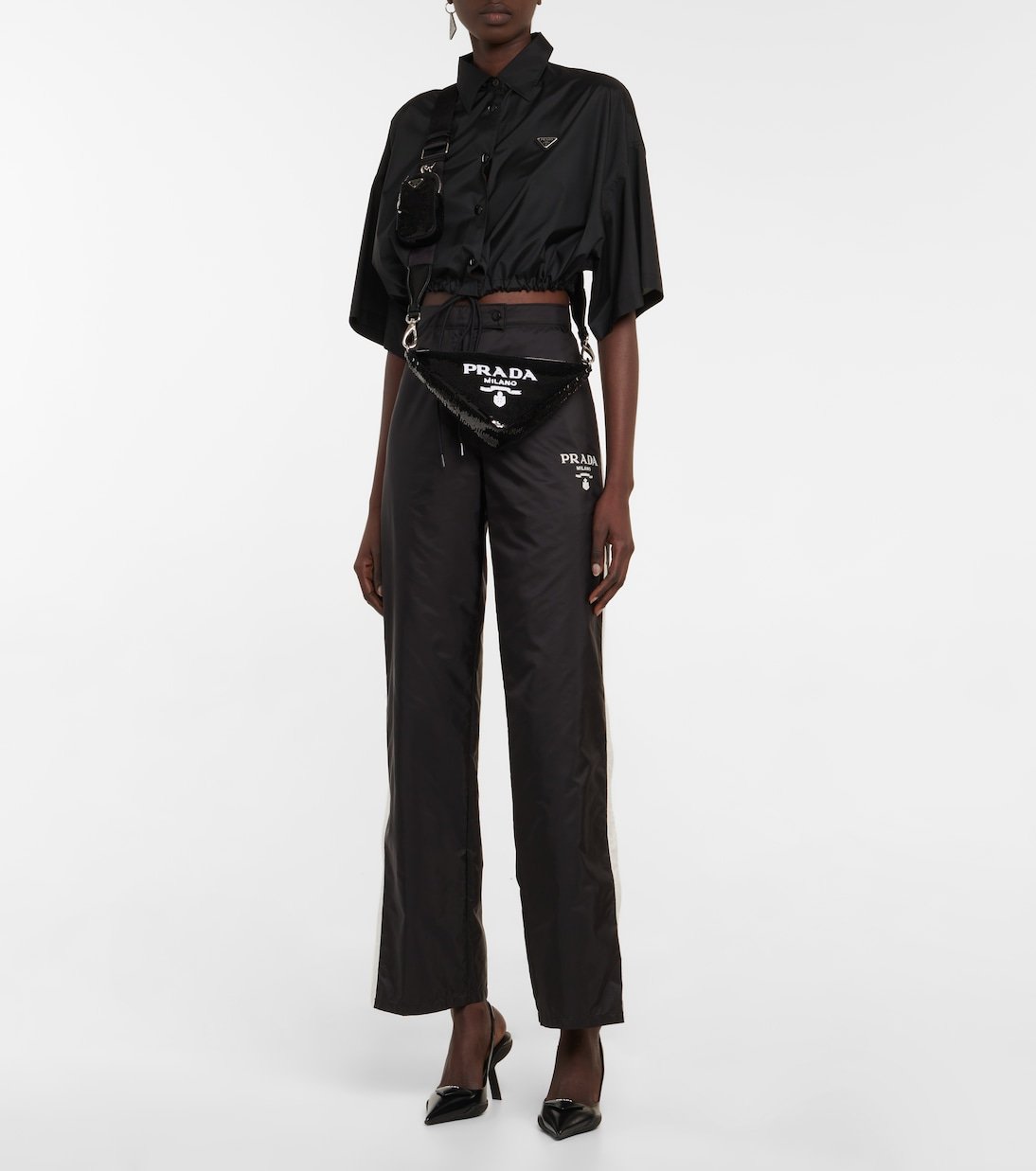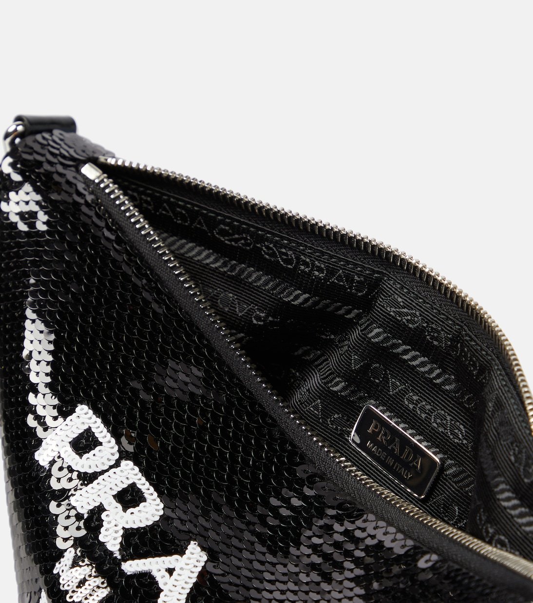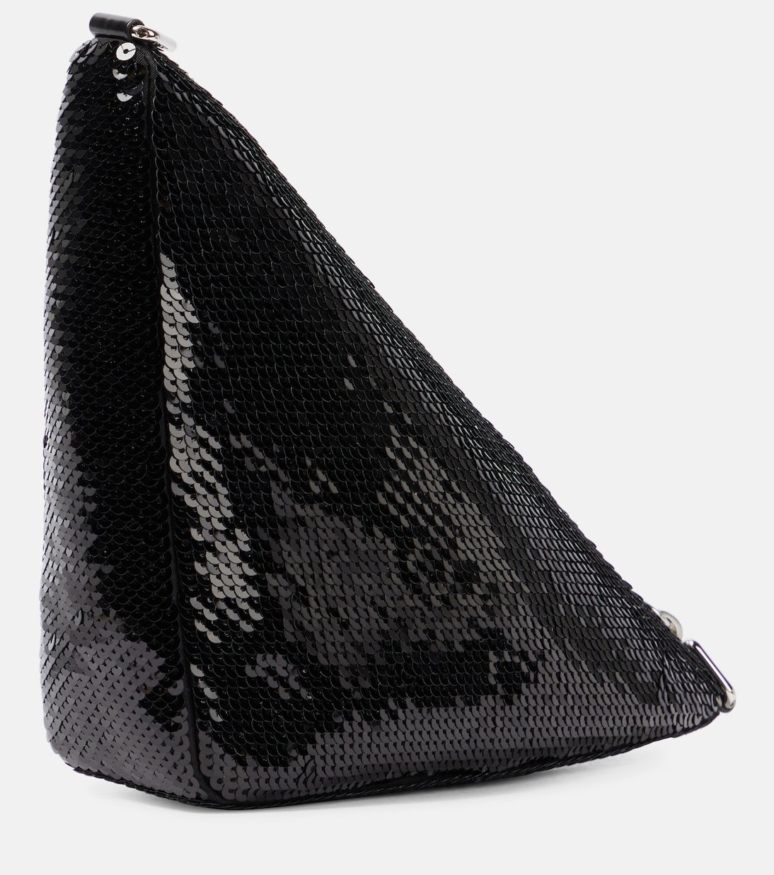 Comme son nom l’indique, le sac Triangle de Prada réinterprète le symbole de la maison italienne. Conçu en tissu habillé de sequins noirs, ce modèle revêt un logo contrastant et s’accompagne d’une pochette amovible.