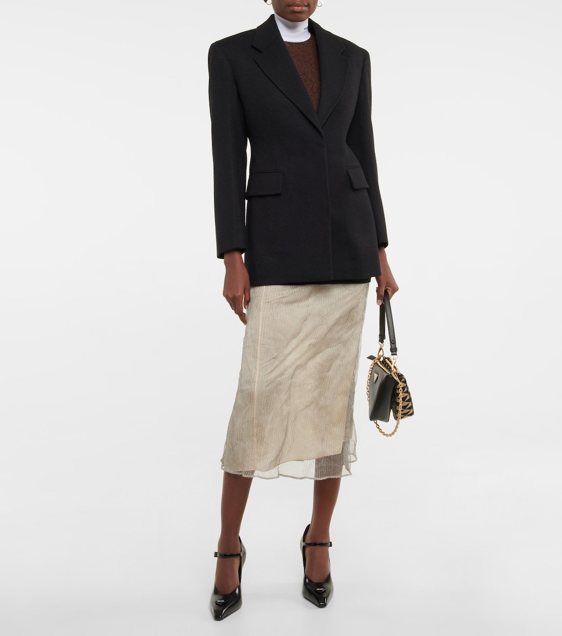 Le sac en jacquard Triangolo Mini de Prada doit son nom à sa forme triangulaire. Bordé de cuir, il est doté d’une bandoulière chaîne et d’une fermeture zippée.
