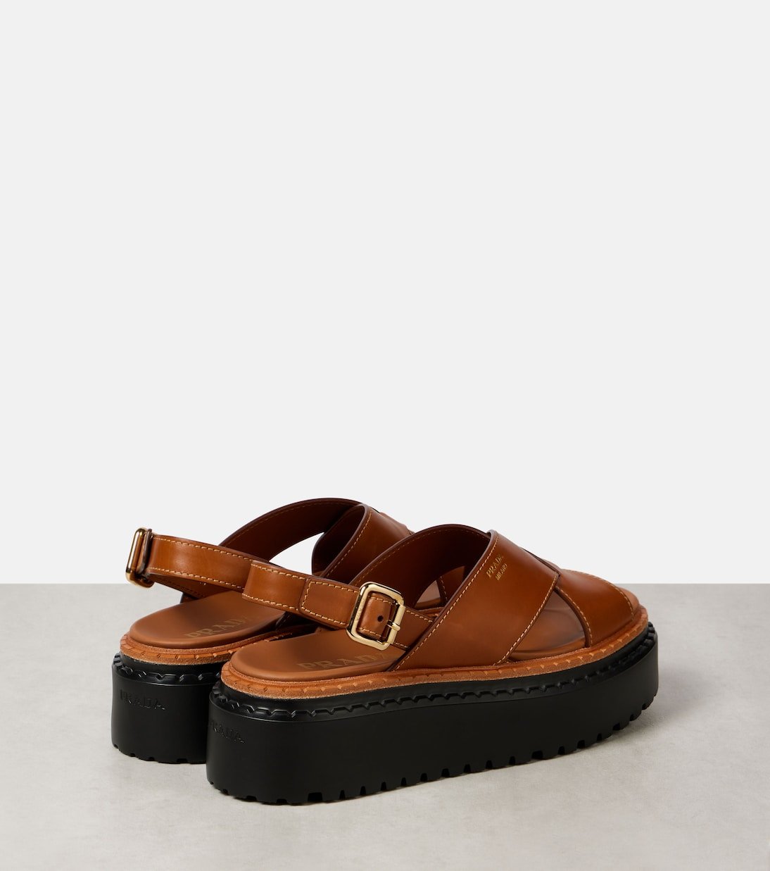 Prada revisite son héritage italien de manière résolument moderne avec des modèles épurés et avant-gardistes. Confectionnées en cuir avec un design croisé, ces sandales sont dotées d’une semelle à plateforme en caoutchouc léger et d’une petite boucle dorée.