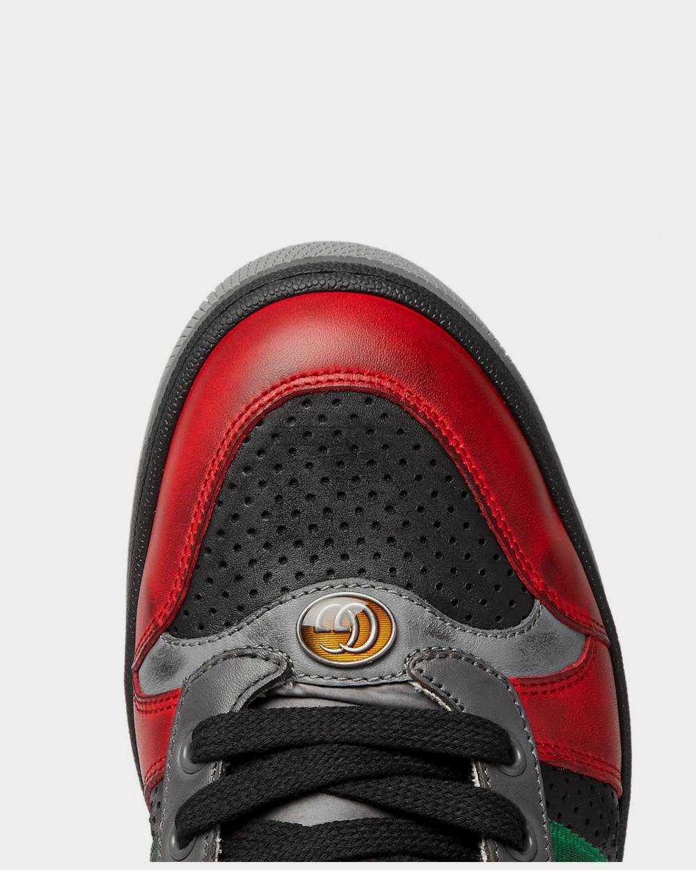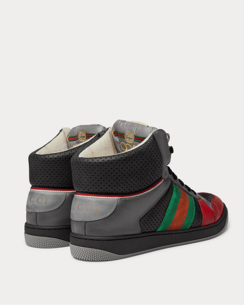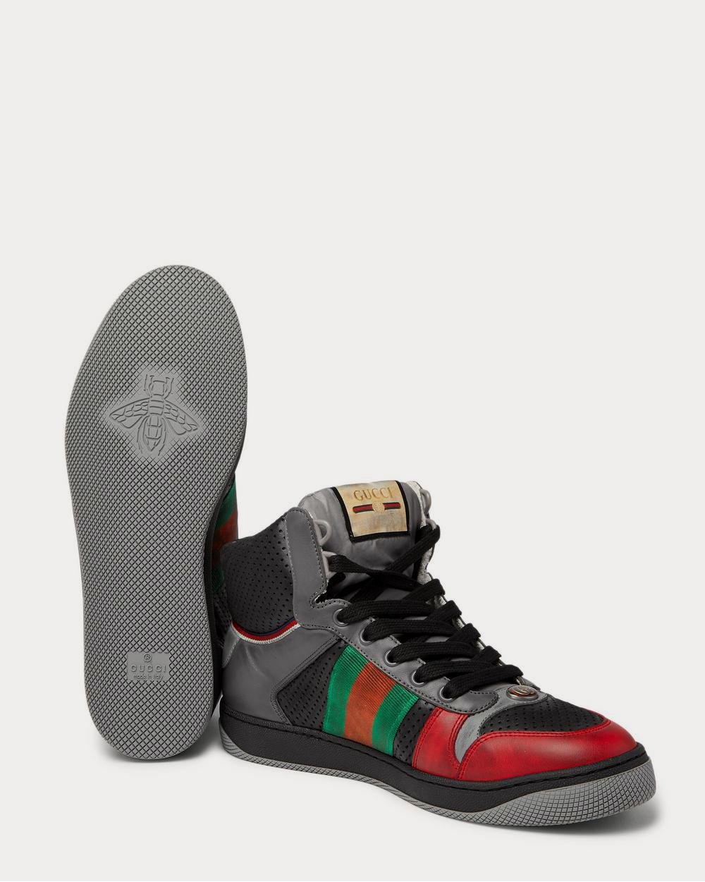 Nommées d’après un mouvement de basketteur, il est facile d’identifier l’influence des baskets « Screener » de Gucci. Confectionnées en cuir soigneusement vieilli pour un aspect usé, elles présentent une silhouette montante inspirée des années 70. Le logo de la marque est estampé sur le talon, des bandes vertes et rouges, des plaques GG et une étiquette vieillie sur la languette.