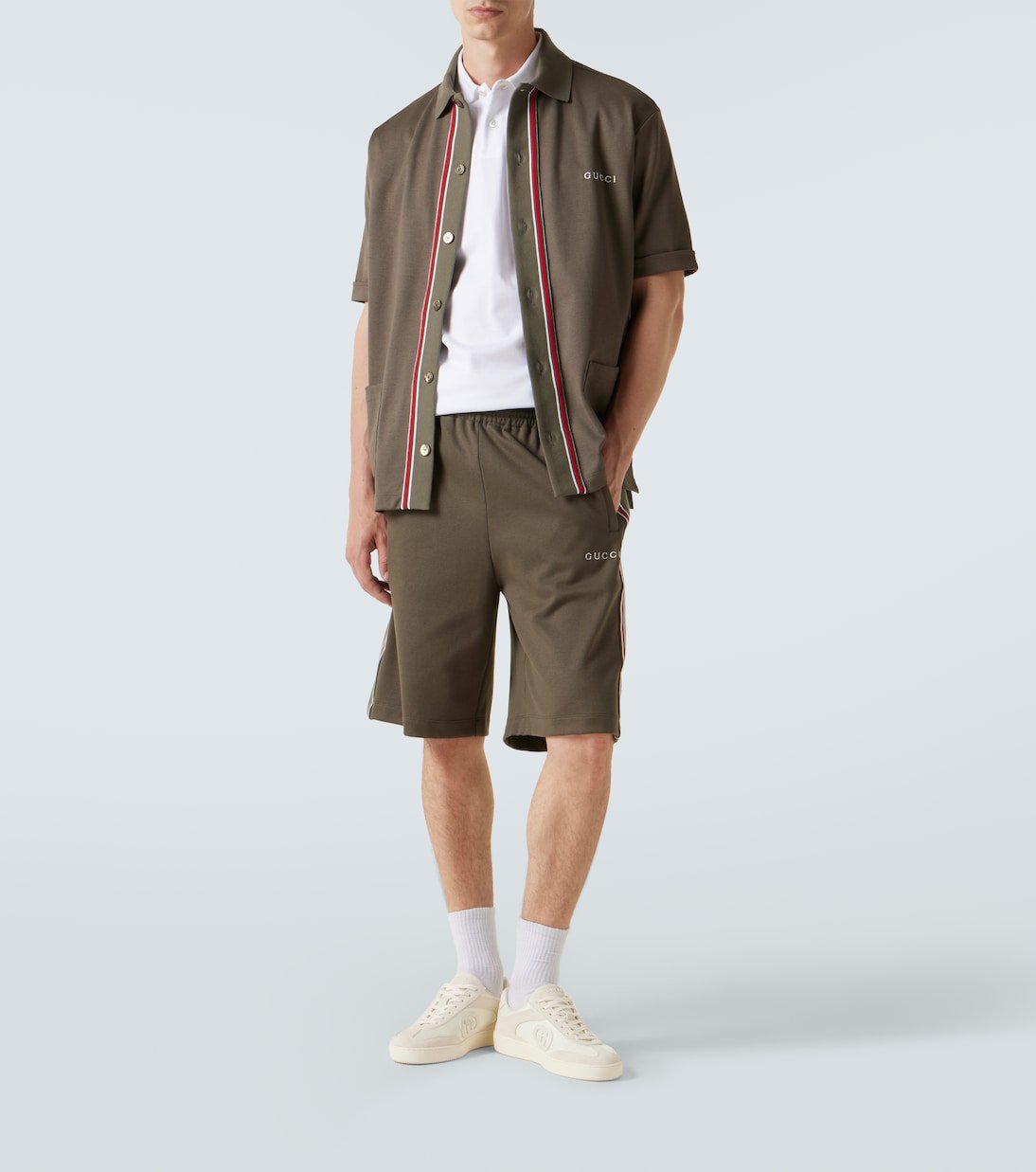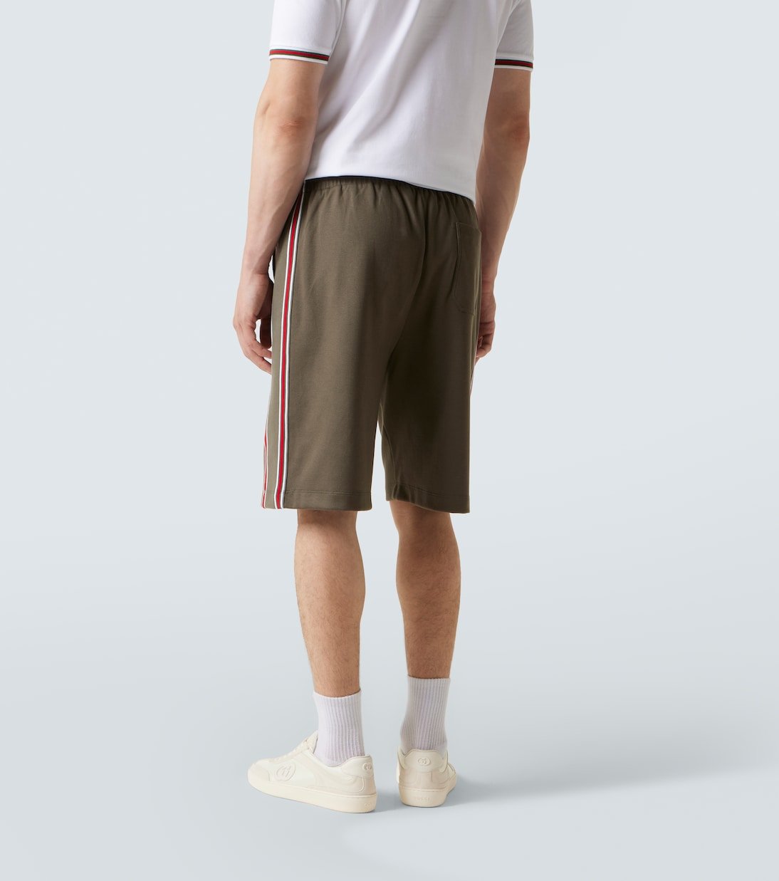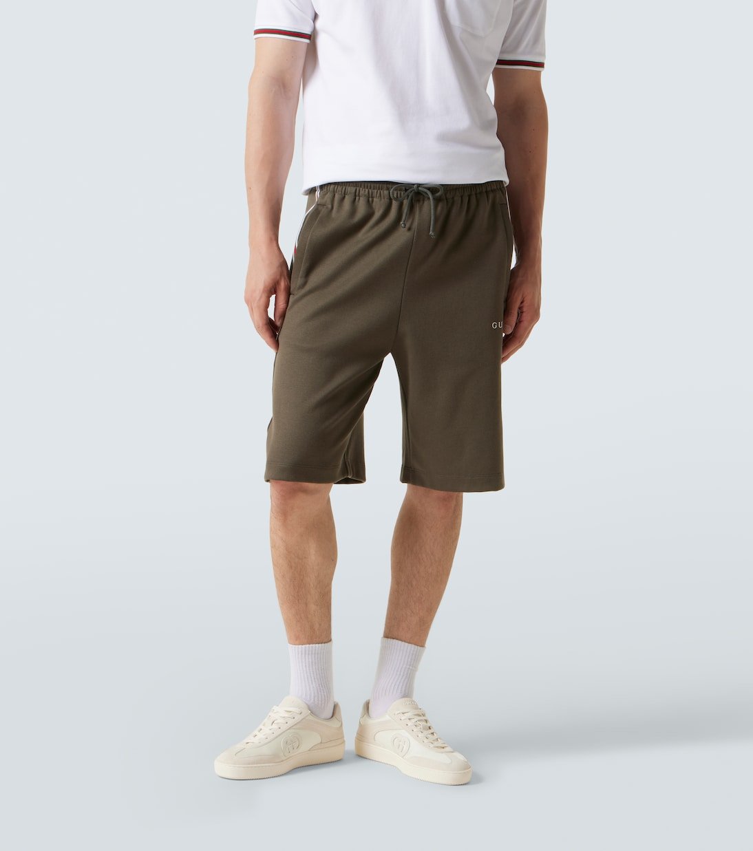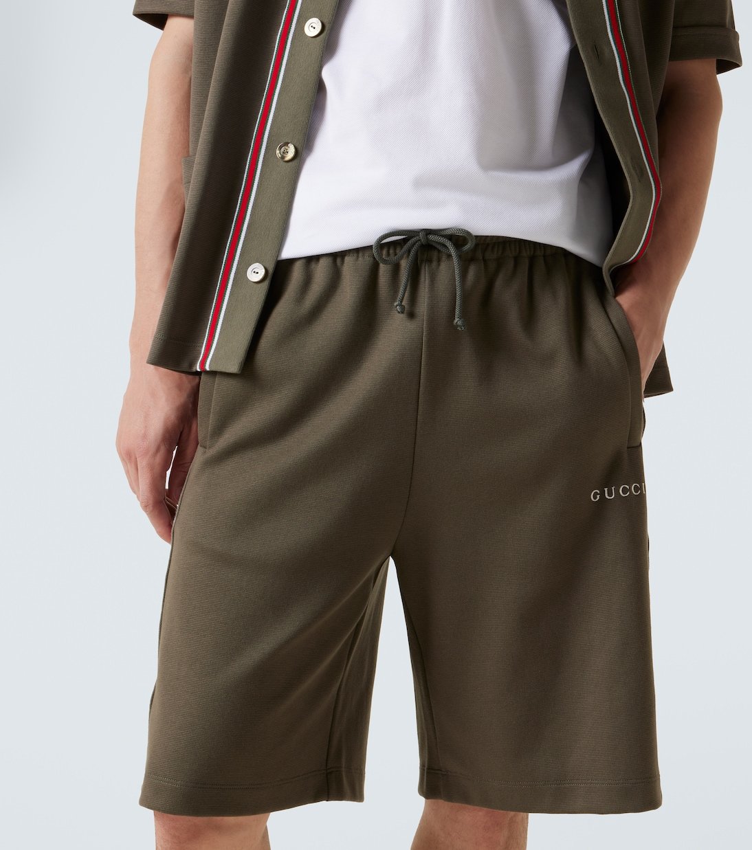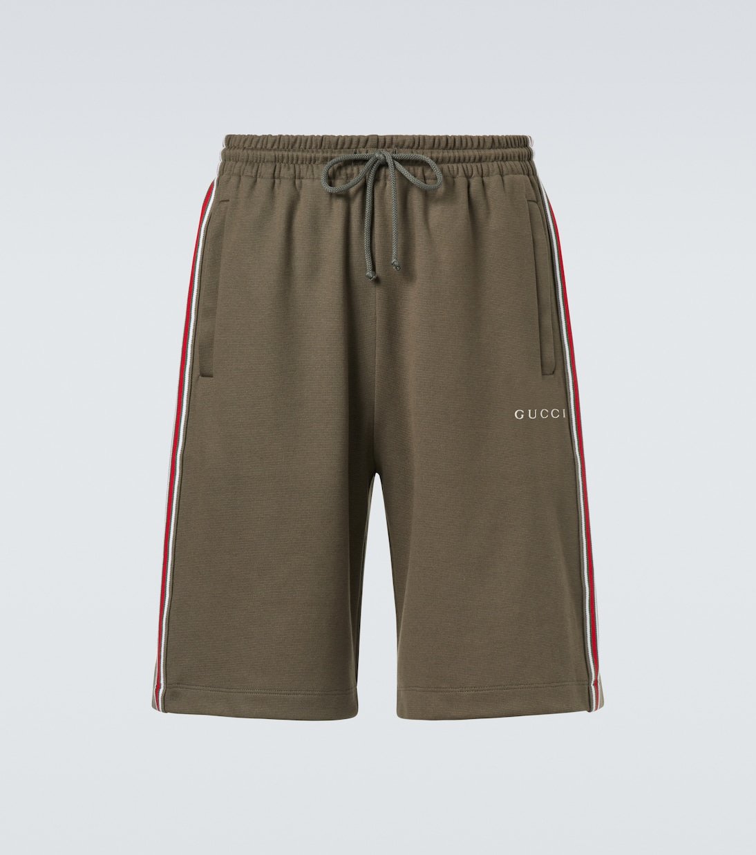 Réalisé en Italie à partir de piqué de coton vert forêt, ce short Gucci présente une coupe oversize avec des rayures Web verticales et un logo brodé. Une taille élastiquée à cordon de serrage assure une finition décontractée et inspirée du label.