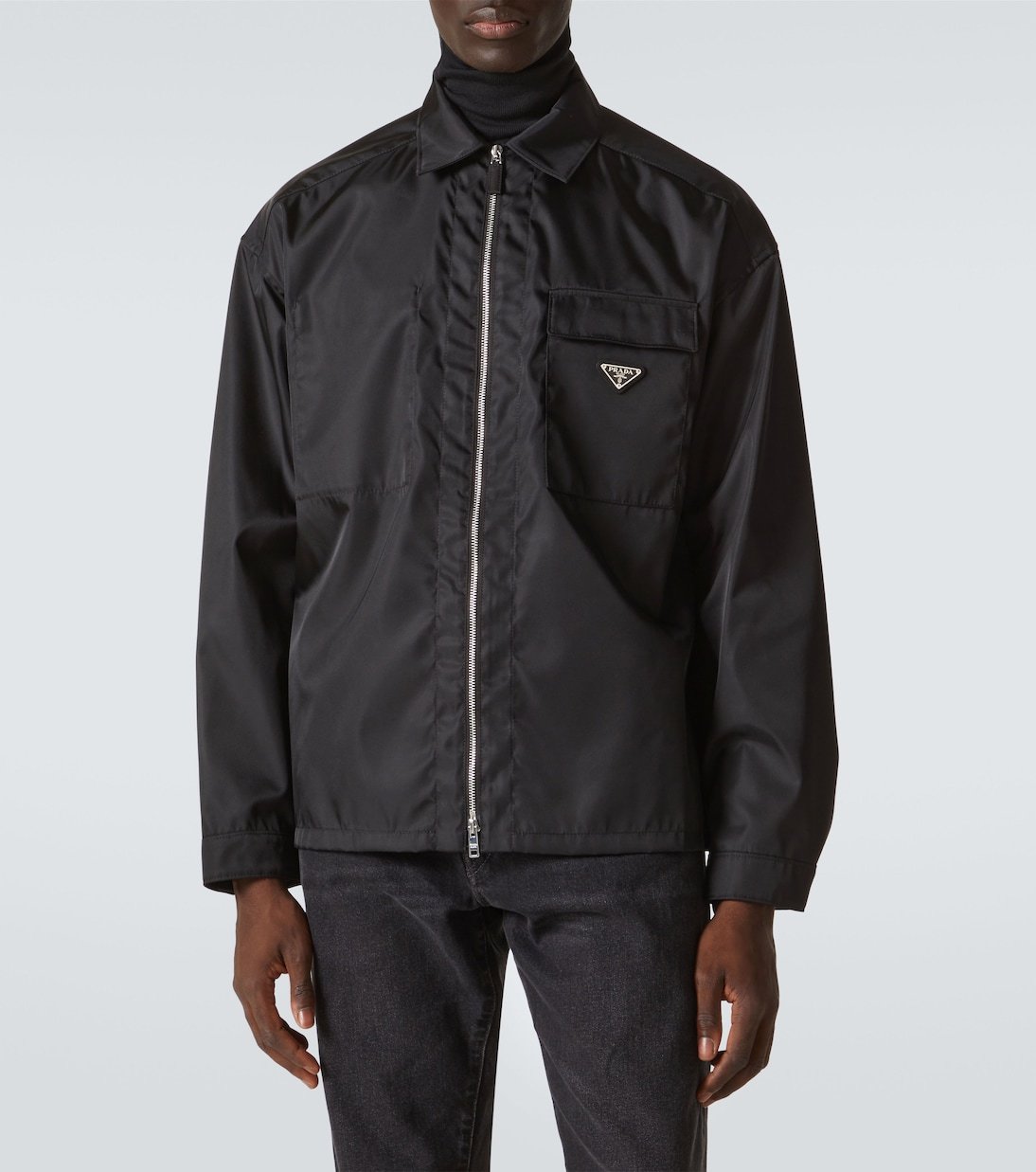 Cette surchemise noire signée Prada a été fabriquée à partir du Re-Nylon signature de la maison. Ce modèle possède des épaules tombantes, un col classique ainsi qu’une poche poitrine dotée du logo triangle de la marque.