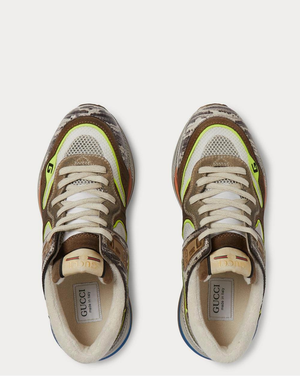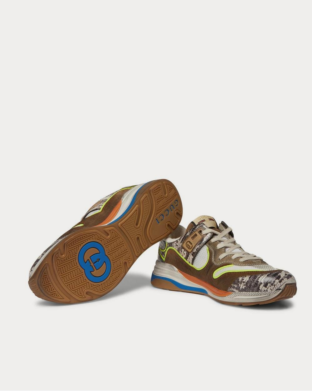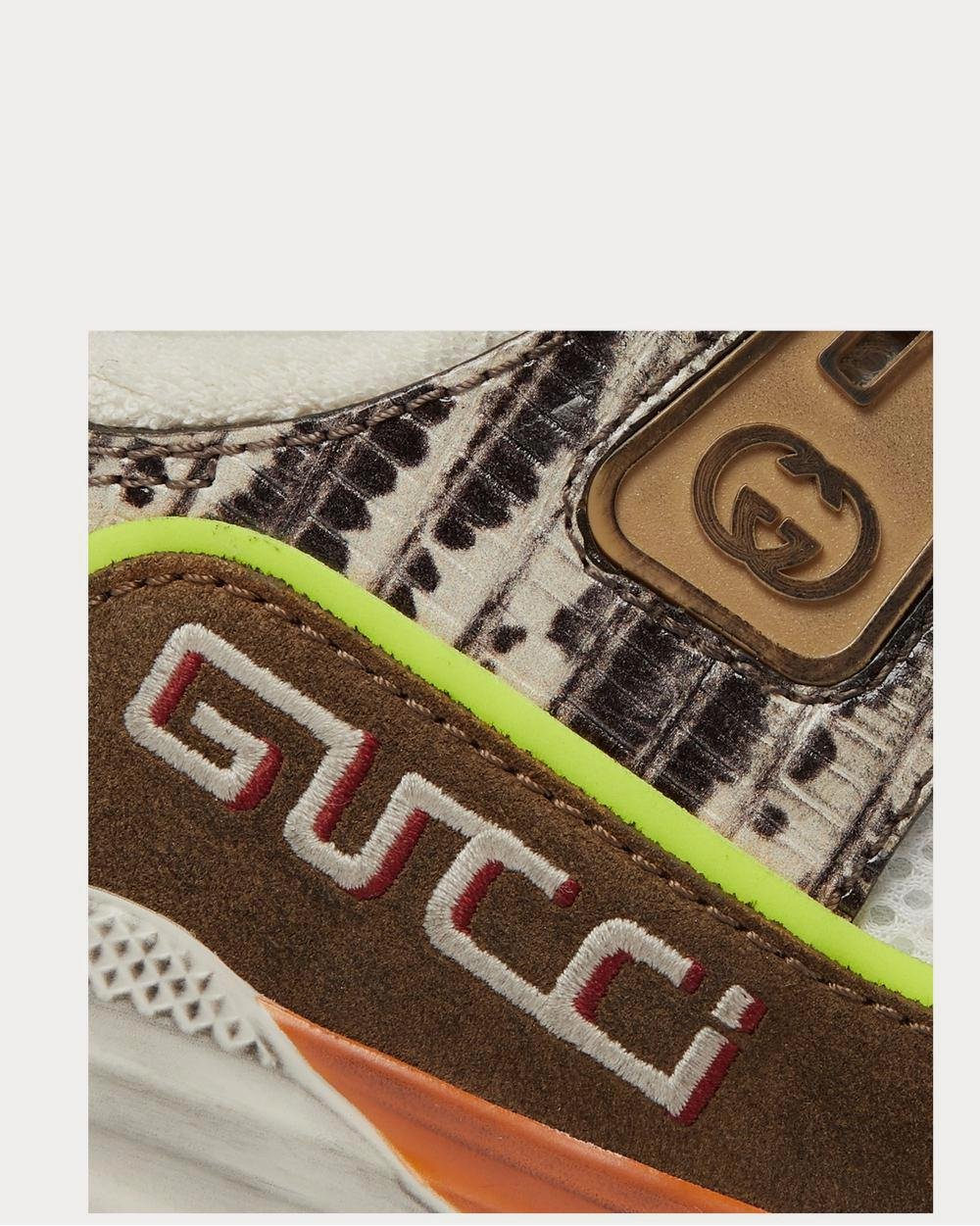 Gucci a le maximalisme à cœur et, avec ces baskets, plus c’est plus. Conçues dans un style de tennis rétro, elles sont composées d’empiècements en cuir effet serpent, de mesh blanc immaculé et de daim vieilli, le tout séparé par un passepoil jaune fluo. Les flancs sont brodés du logo de la maison, inspiré des jeux vidéo, tandis que les semelles sont ornées d’emblèmes peints à la main.