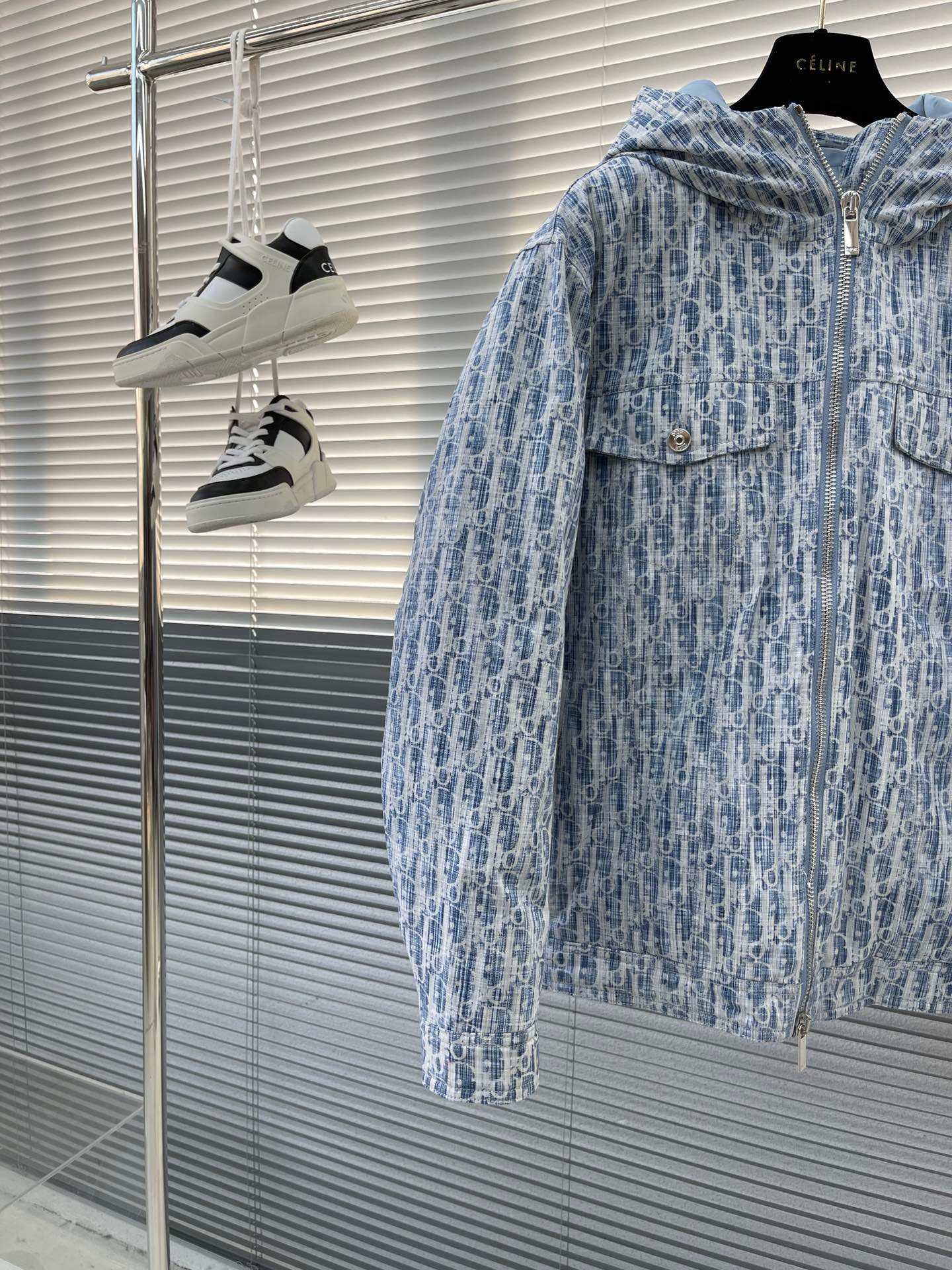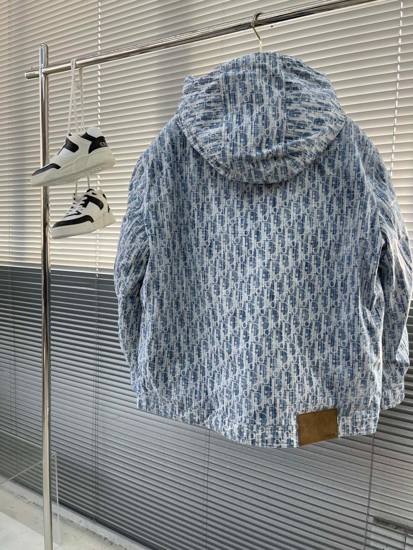 Veste à capuche Dior Oblique bleu clair, matelassée, zippée double curseur, confortable et élégante.