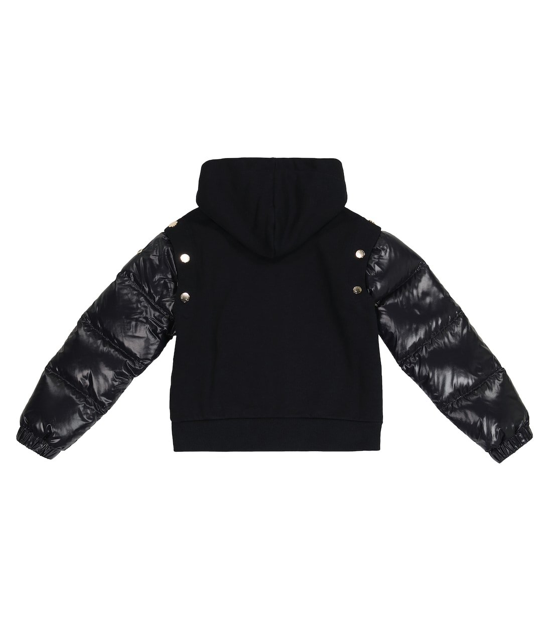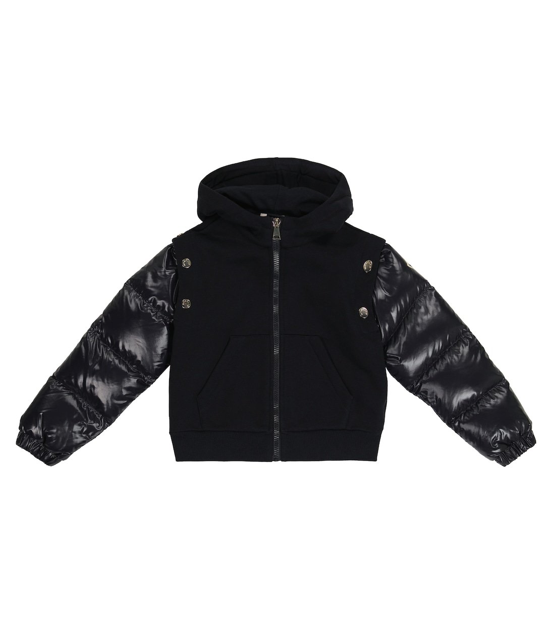 Cette veste à capuche Moncler Enfant est une version revisitée d’un modèle hybride : elle est confectionnée en coton et possède des manches doudoune amovibles.
