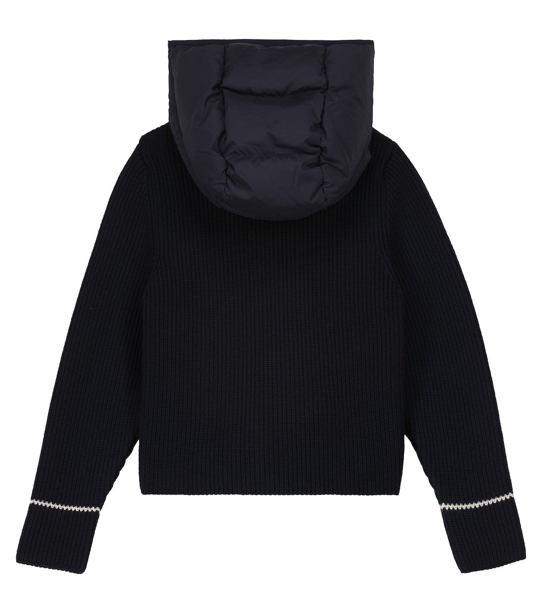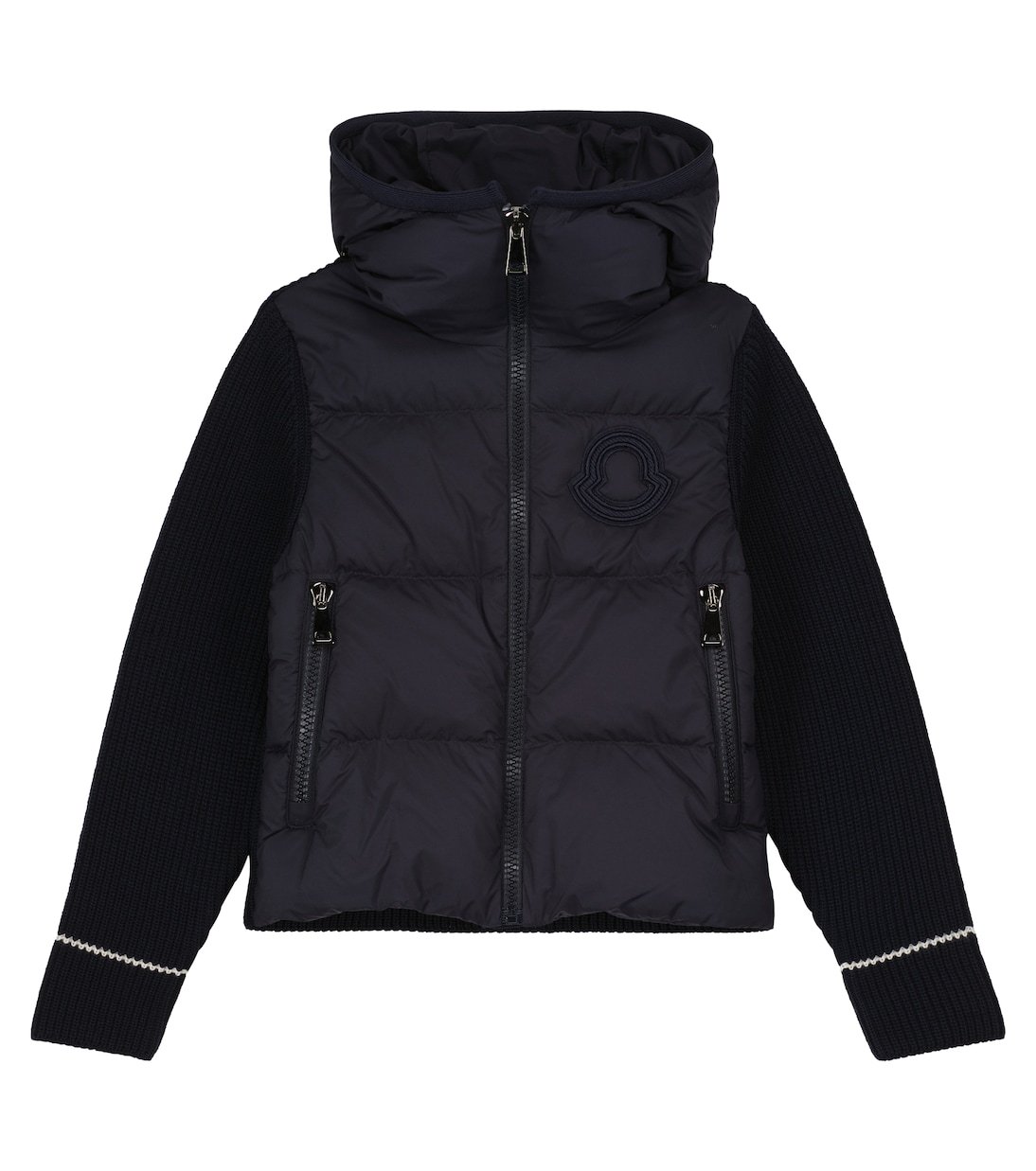 Cette veste à capuche de Moncler Enfant est conçue avec un corps matelassé en duvet et des manches côtelées. Elle est déclinée dans un coloris bleu marine polyvalent et arbore un écusson logo ton sur ton sur la poitrine.