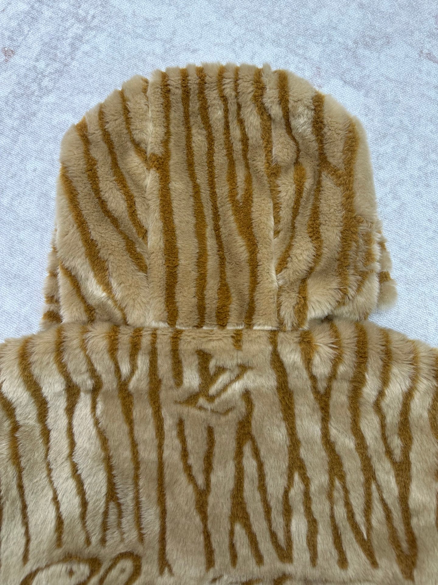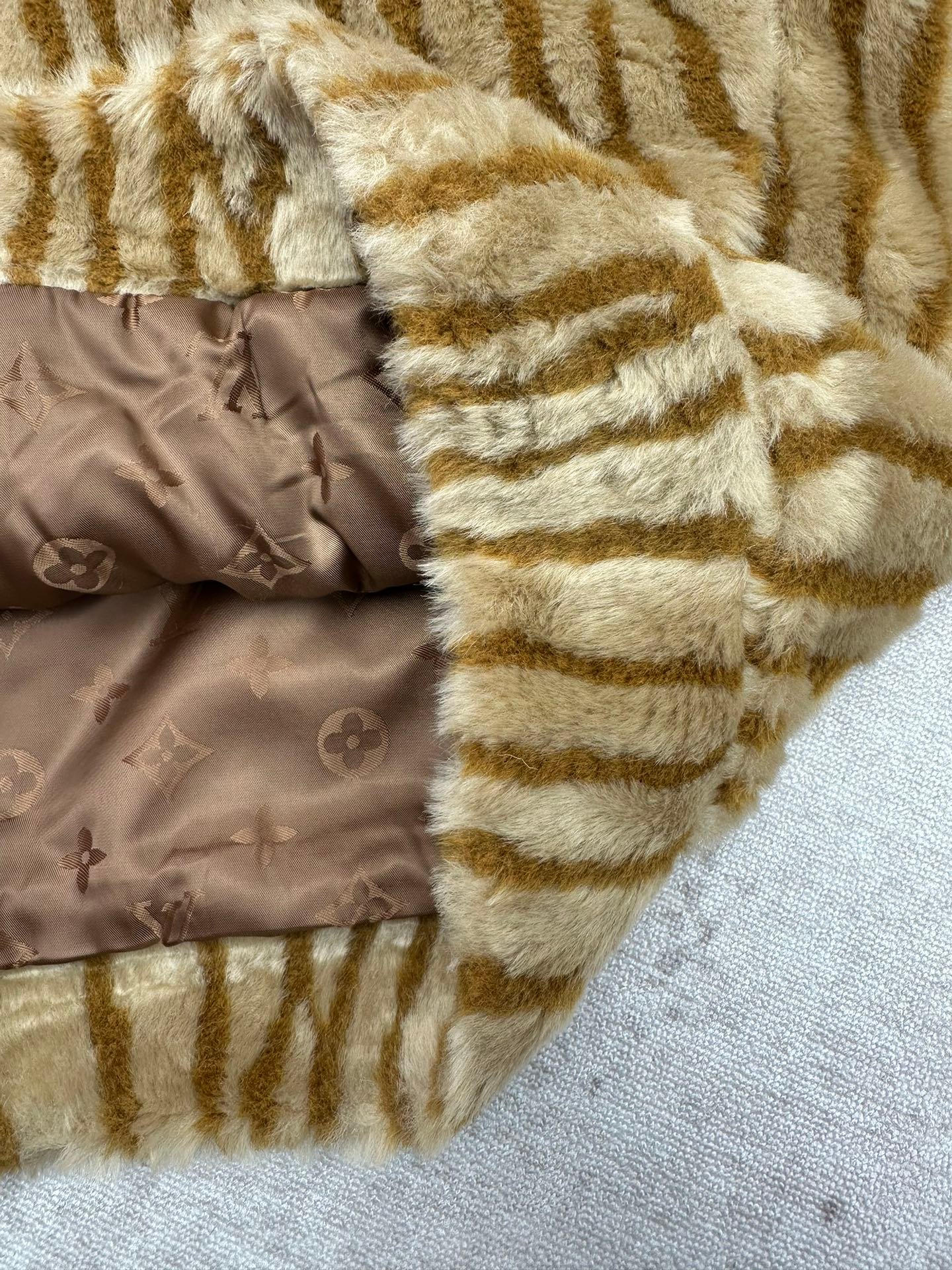 - Design emblématique : Motif Monogram Louis Vuitton sur une fourrure synthétique douce, alliant luxe et praticité.