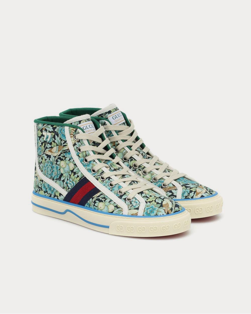 Gucci prolonge sa collaboration avec Liberty London en intégrant les imprimés emblématiques de la marque sur les baskets cultes Tennis 1977. Cette paire montante est confectionnée en toile avec des semelles intérieures confortables en tissu et des semelles en caoutchouc. Un motif botanique d’inspiration Tudor et un passepoil turquoise rejoignent les bandes Web emblématiques sur les côtés.